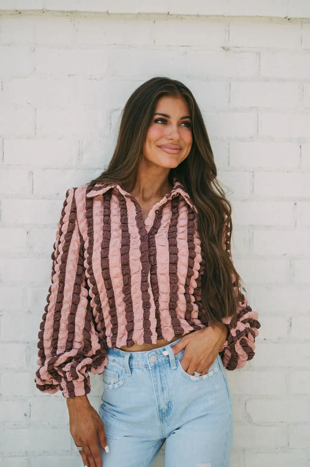 Look stylish and feel confident with the Aria Textured Top. Featuring a button up front, collared neckline, and bubble long sleeves, this top provides a flattering fit and modern silhouette. The Mauve Mix is the perfect addition to any wardrobe.