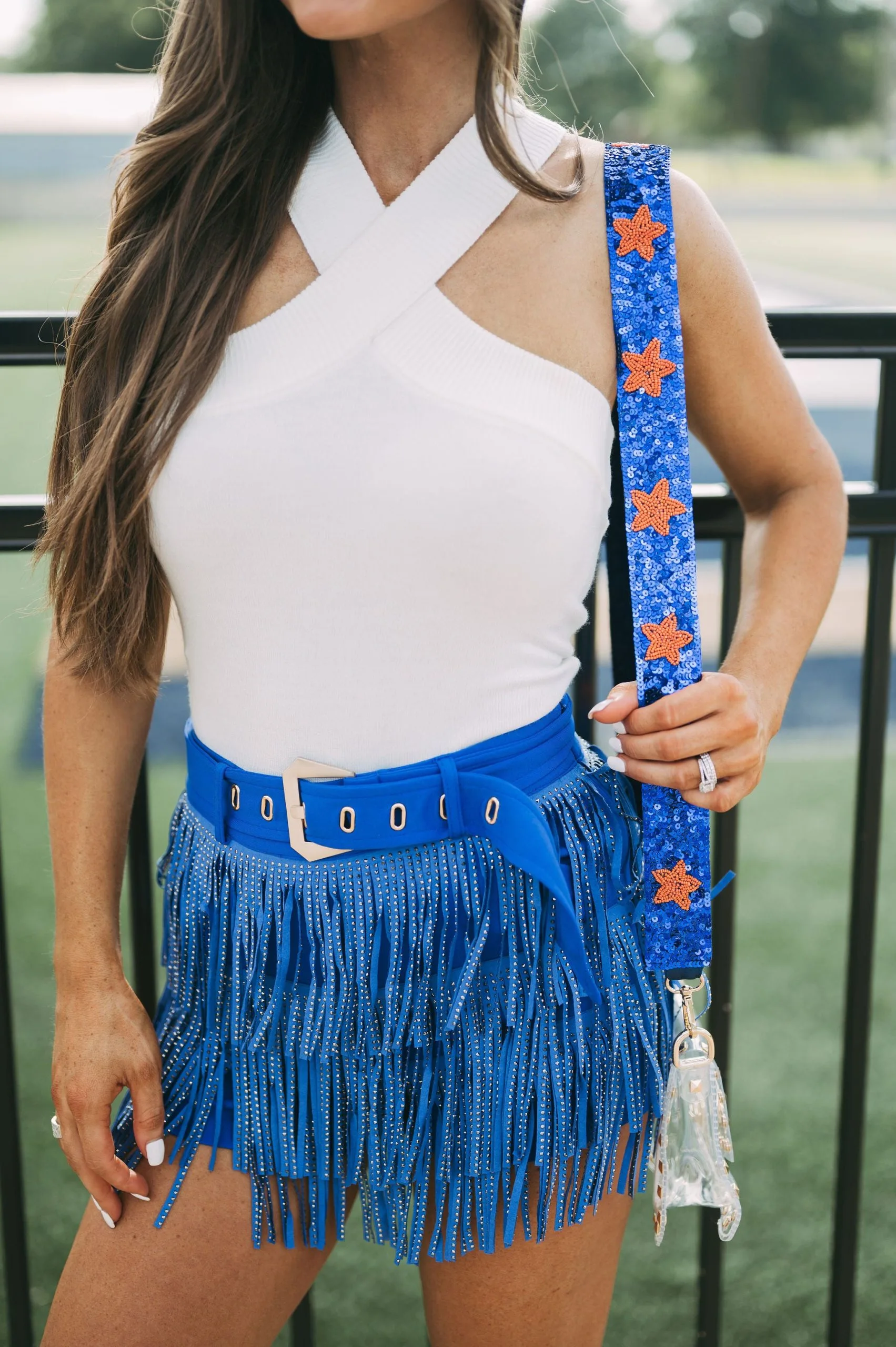 Complete your look with this stunning beaded strap! Rich blue hues combine with orange stars to create a unique statement piece that will take any purse to the next level. Add a touch of shine and sparkle with this gorgeous strap.