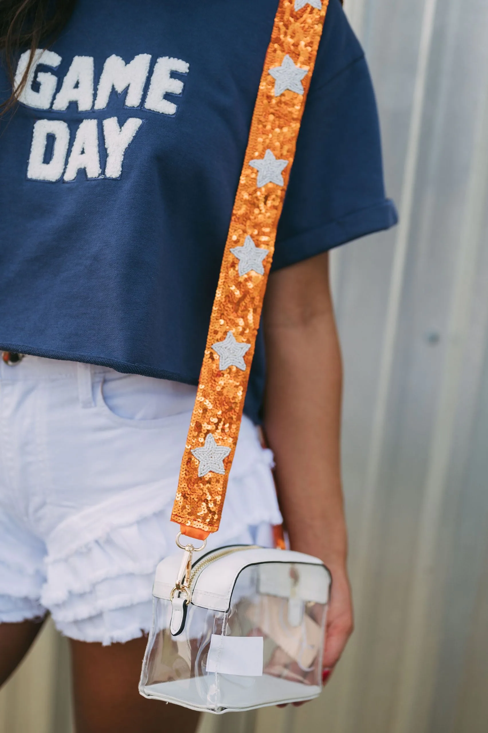Complete your look with this stunning beaded strap! Rich orange hues combine with white stars to create a unique statement piece that will take any purse to the next level. Add a touch of shine and sparkle with this gorgeous strap.