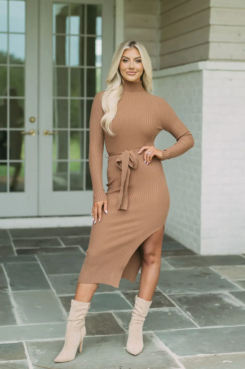 - Be ready to turn heads in the Blakely dress! Made of a luxuriously ribbed knit material in a stunning Caramel hue, this midi dress features a turtleneck and a flattering waist tie, along with a side leg slit for added style. Step out in sophistication and class.