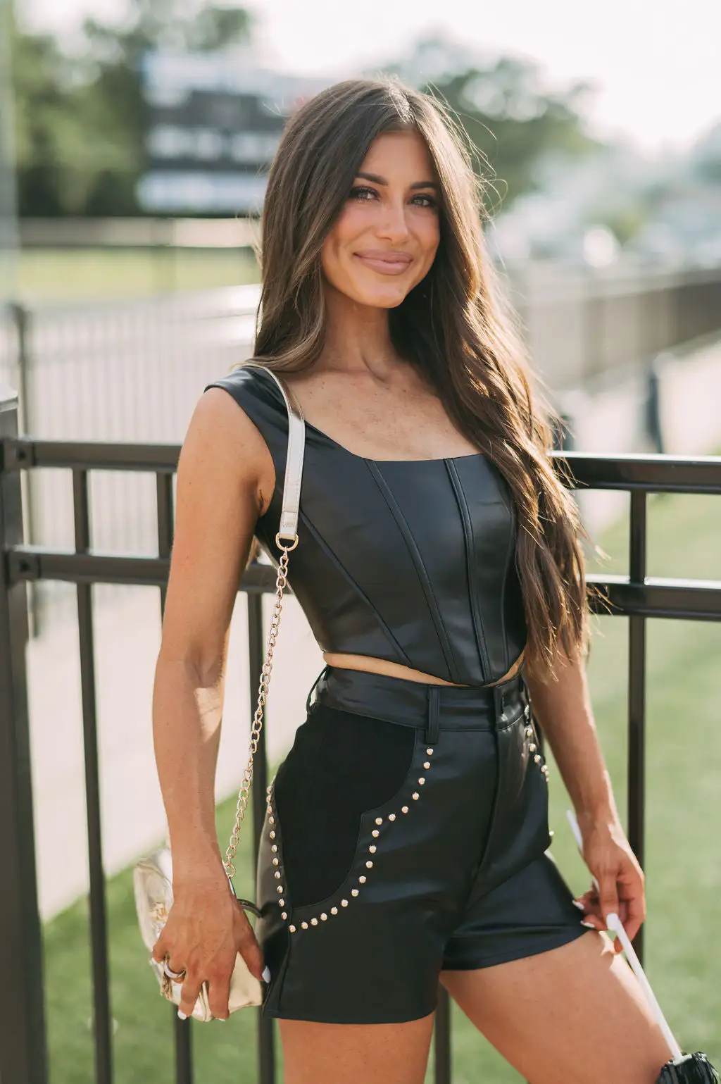 - Look chic and fabulous in our Brentley Faux Leather Corset Top. Crafted from sleek black faux leather, this crop top features a highly flattering corset bodice with a back zipper closure for a stylish and secure fit.