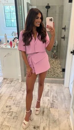 - Model is 5’6″ with a 35″ bust and a 26″ waist wearing a size small.