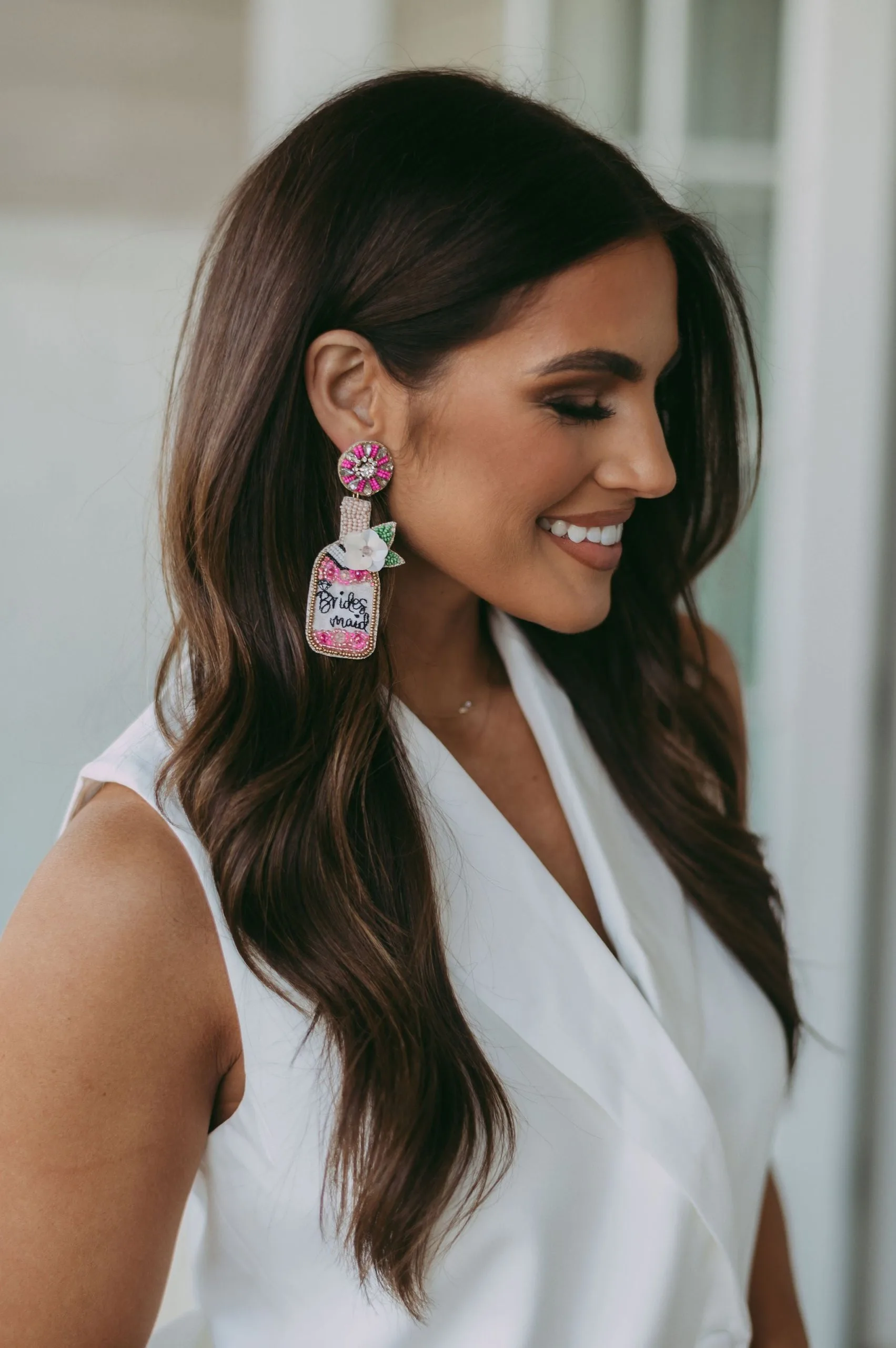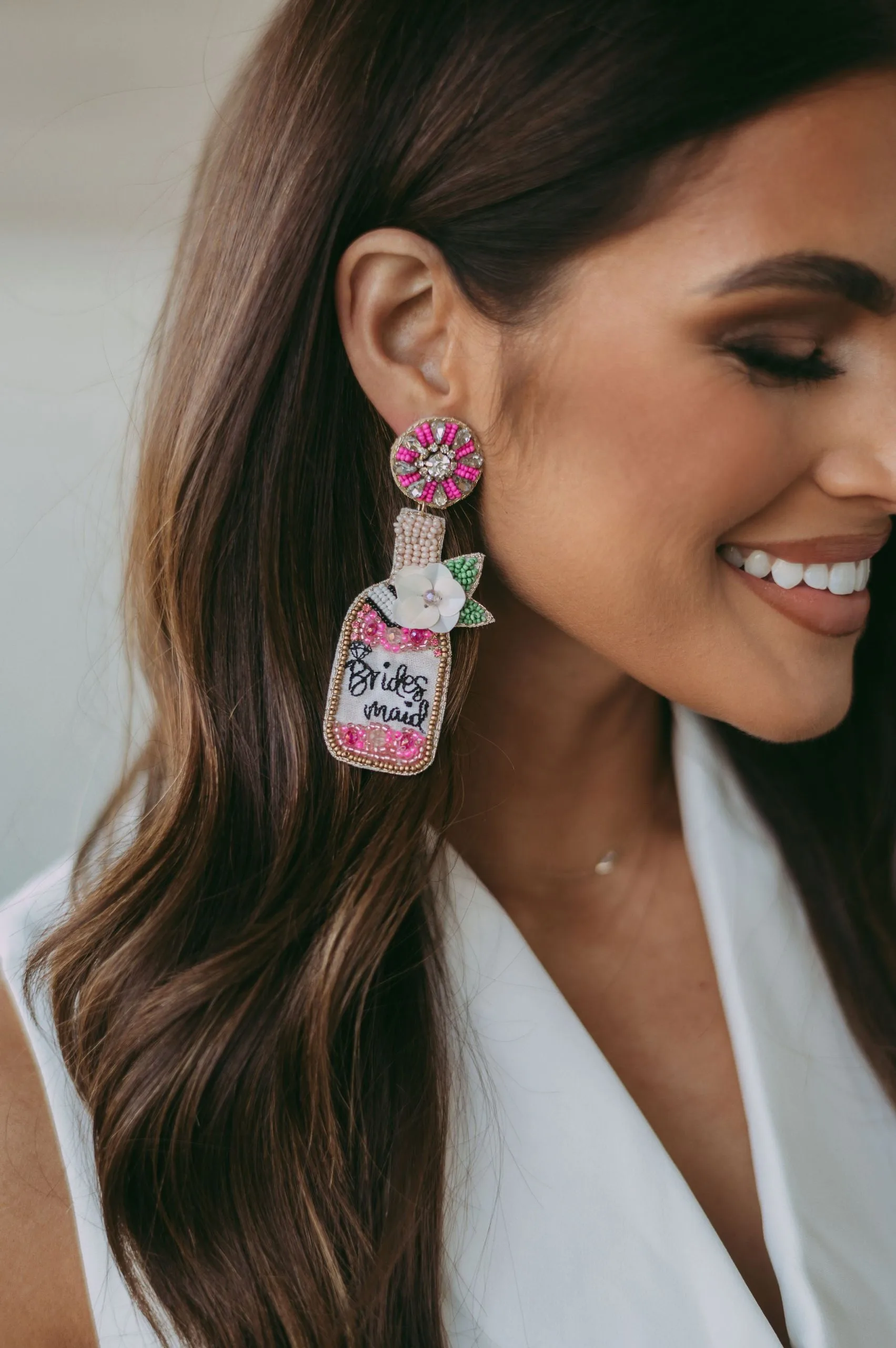 - White and pink earrings featuring “Bridesmaid” in black writing and floral accents