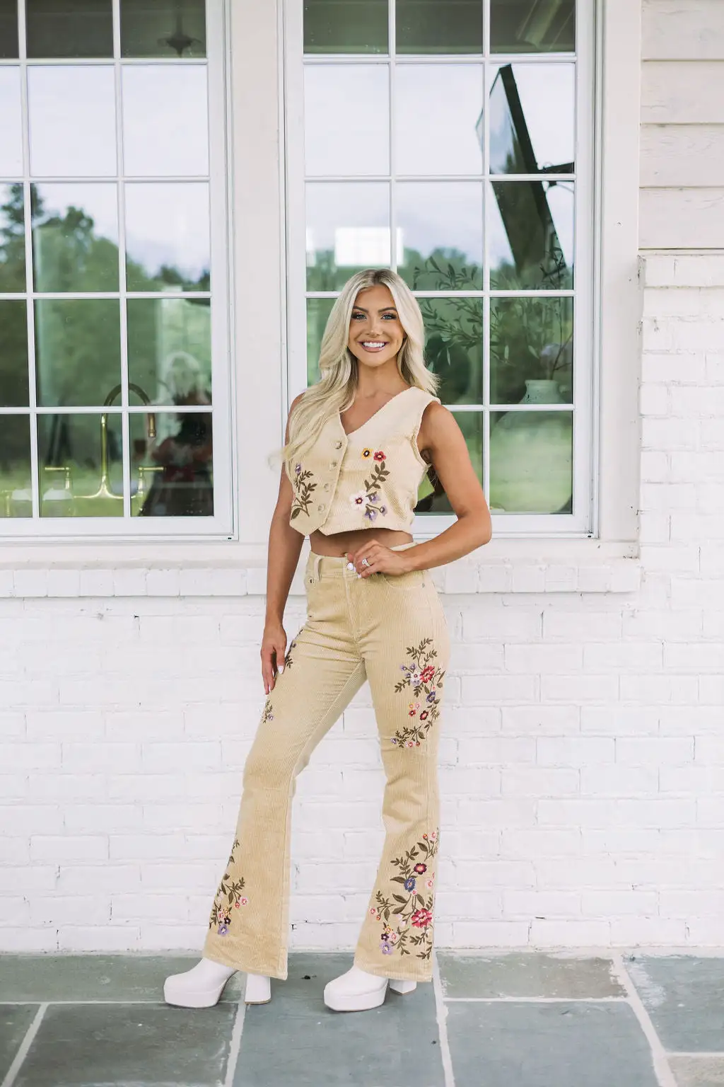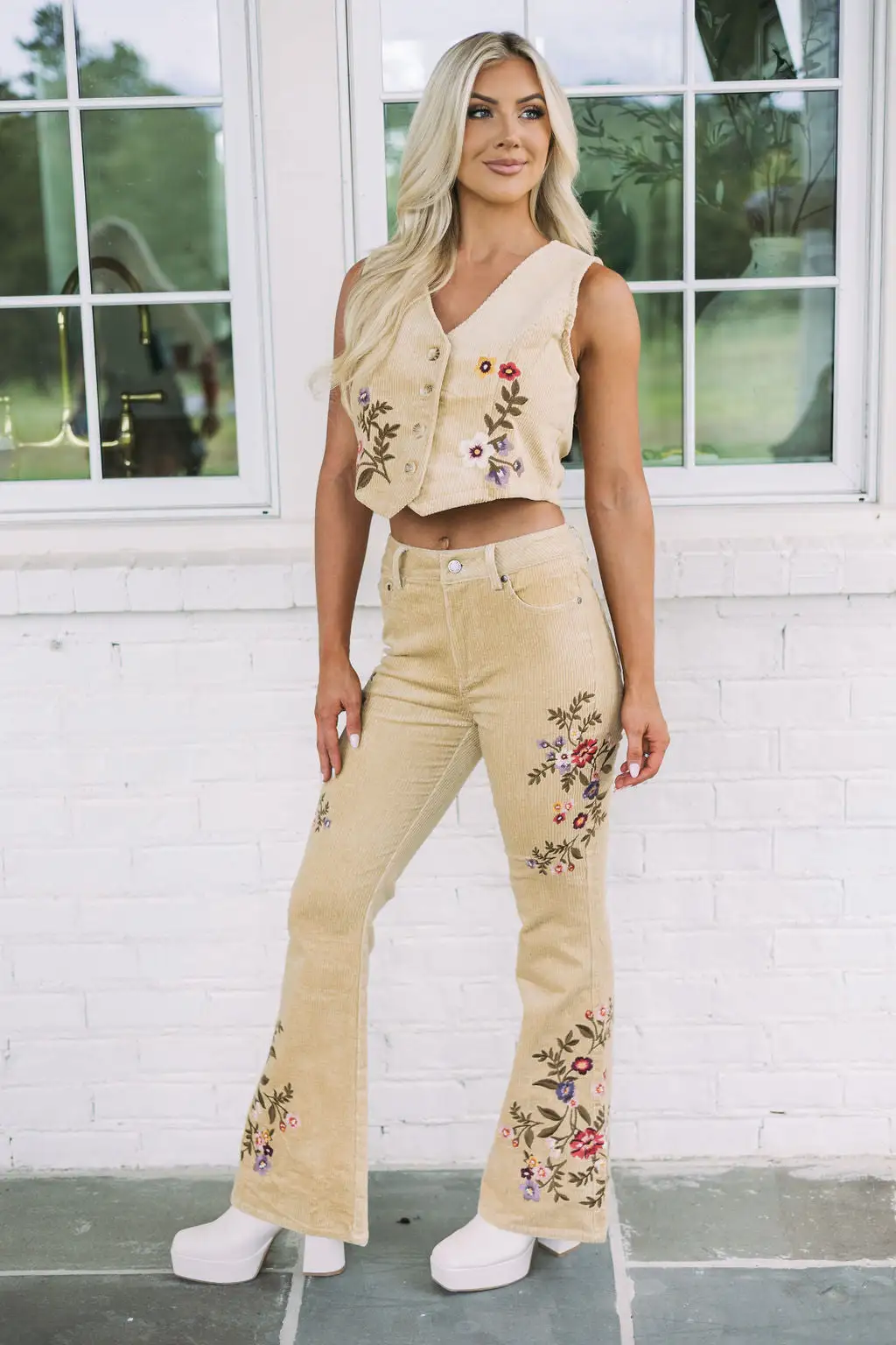Stay stylishly warm in this cozy, beige corduroy vest top featuring beautiful floral embroidery. Perfect for casual days or a night out, the button up front keeps you looking smart and put together. Make your look unique with this versatile and timeless piece!