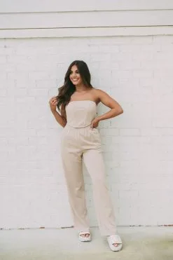 This two piece set offers timeless style and comfort. The beige corset-style top features a strapless design and cropped bottom hem for a flattering fit, while the high waisted sweatpants have pockets for convenience!