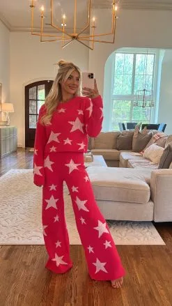 - Experience the perfect lounge look with the Hot Pink Cozy Star Print Pants Set. This set features hot pink sherpa with a star print, flared bottom hem, and a stretchy, high waisted fit for maximum comfort. Look and feel stunning!
