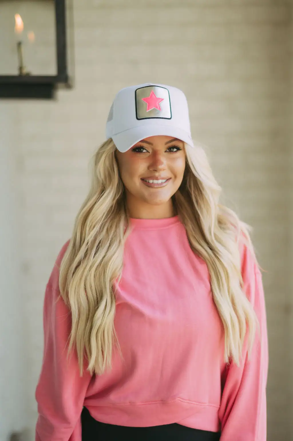 The Everyday Trucker Hat-White is a must-have for every modern wardrobe. The classic white vintage Havana style is enhanced with a stylish metallic patch featuring a hot pink star – perfect for adding a subtle pop of color to any outfit. Its unique design ensures you look on-trend and fashionable all year round!