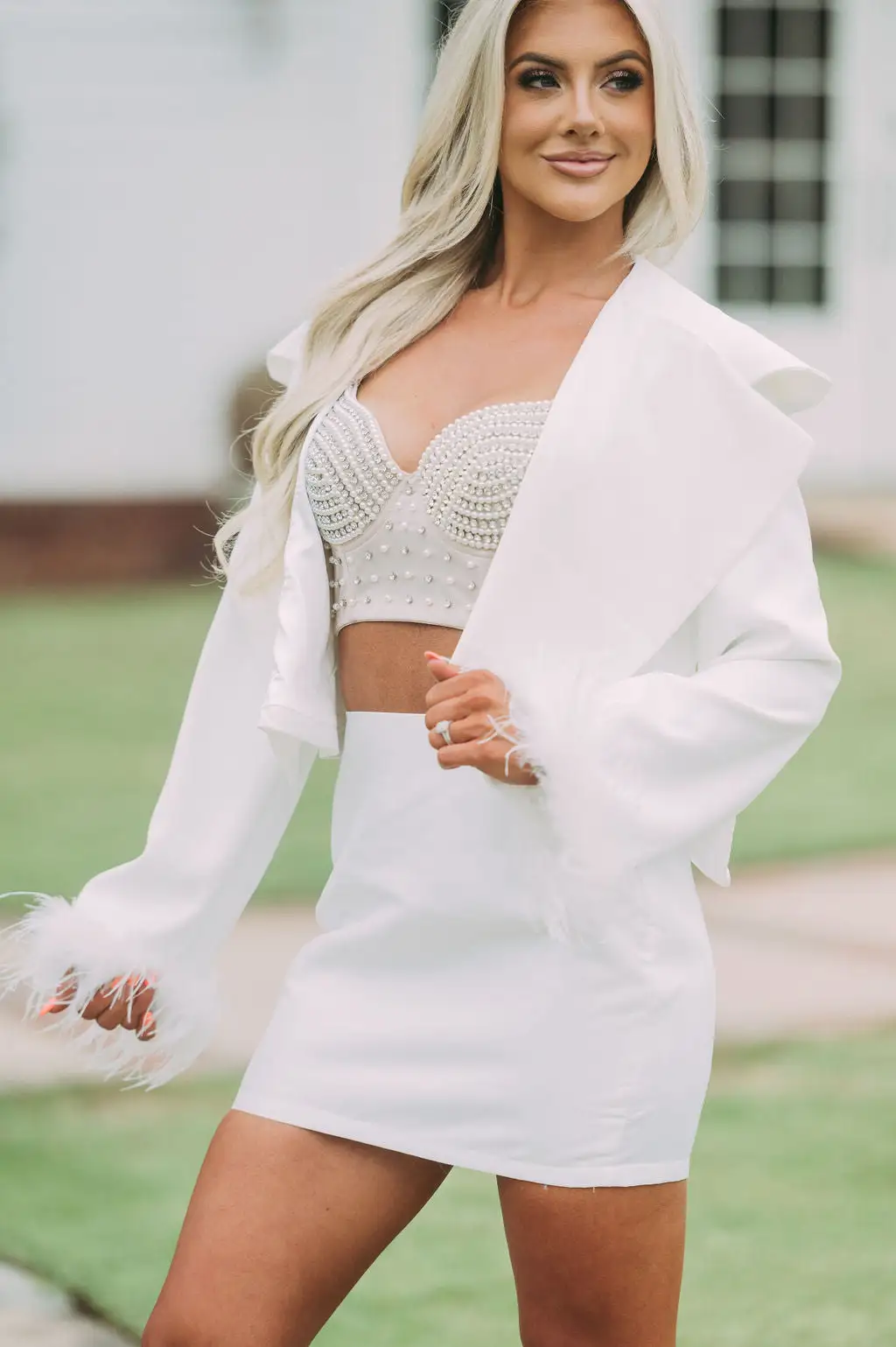 - Stay on-trend with this stylish cropped blazer. Crafted in a white material, this oversized blazer features a unique feather detail at the sleeves, adding a show-stopping touch to your look. Perfect for a special occasions.