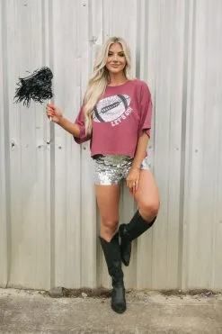 Be ready for the big game in style with this Football Sequin Tee-Maroon. Crafted from an oversized red tee with a glittery silver sequin football, this tee features “Lets Go” on the front and is slightly cropped. Perfect for cheering on your favorite team and showing some team spirit in the stands.