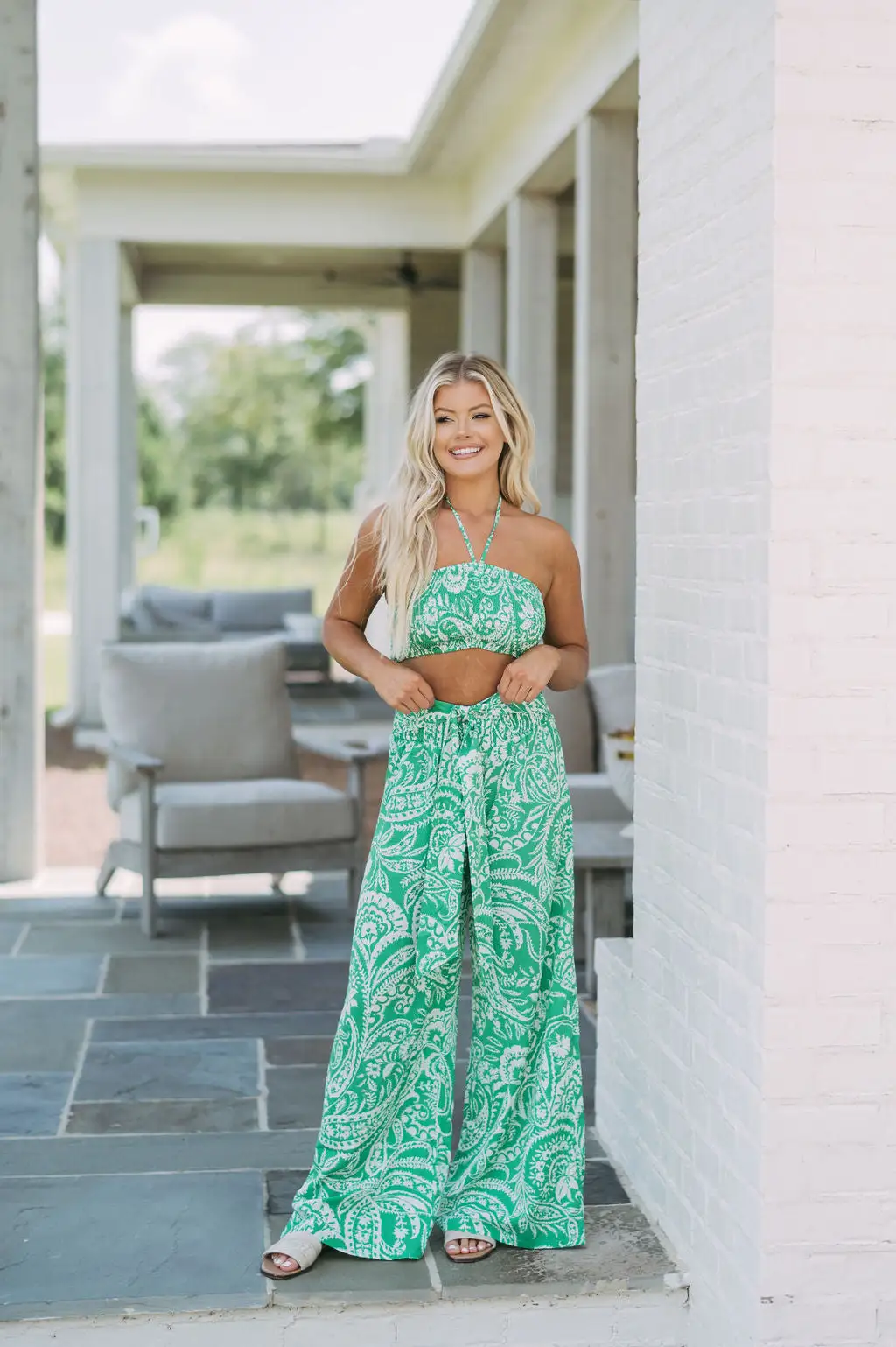 This stylish Green Mist Pants Set features a perfect combination of comfort and style. The true green color is complemented by an eye-catching white abstract print. The cropped smocked halter top and wide leg pants with a smocked hem make this set a great choice for any occasion. The adjustable belted waist allows for a great fit no matter what your body shape.