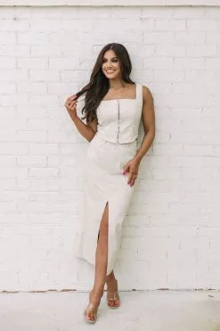 Experience timeless style with this exquisite leather front slit midi skirt. Crafted from vintage cream leather, this high waisted piece has a midi length, features a front slit, and comes complete with side pockets. Embrace this timeless classic and step out in style!