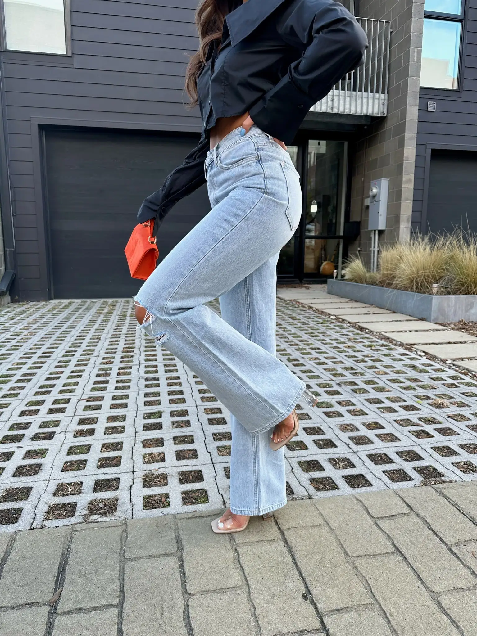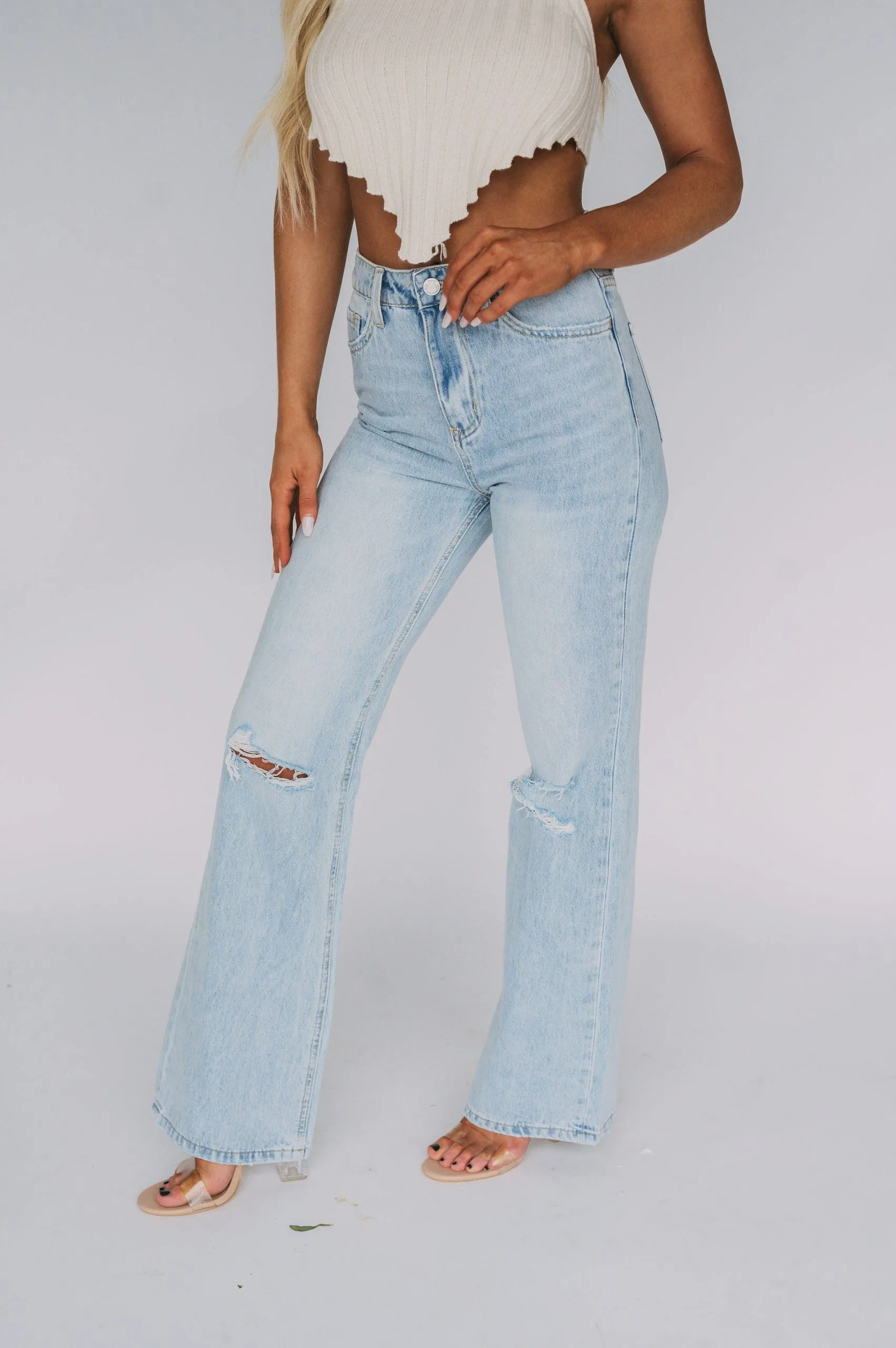 - Light wash jeans featuring a high waisted fit, a button fly closure, and distressed detailing along the knee caps!