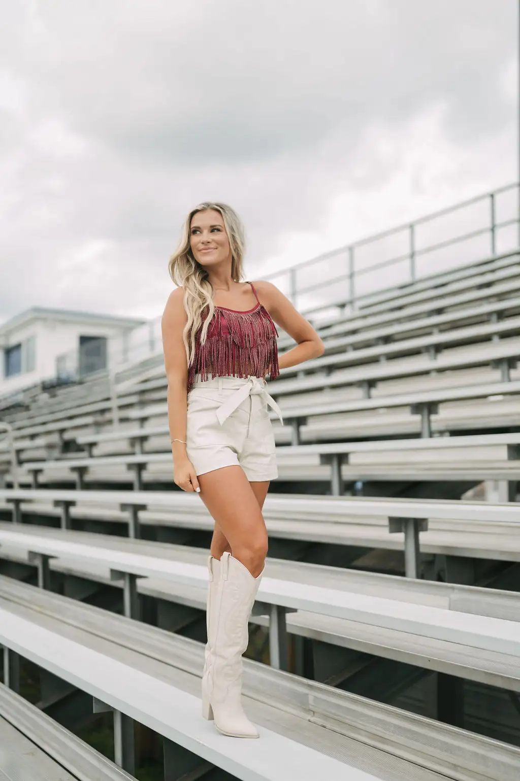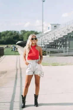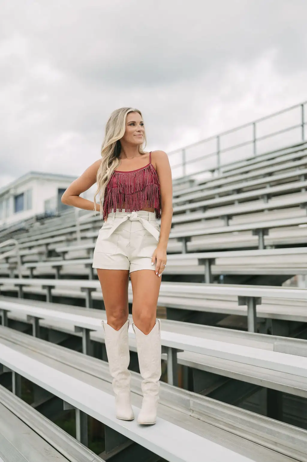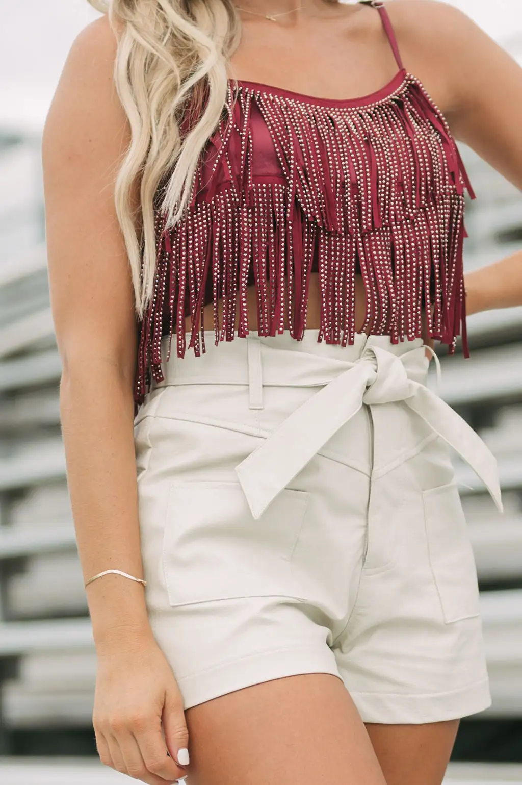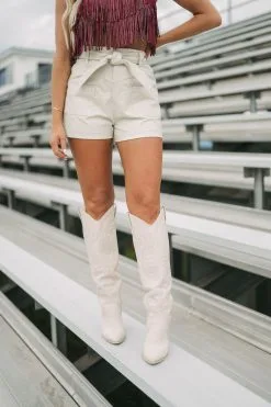 - Embrace the elegant style of the Maggie Faux Leather Shorts- Ecru. These high waisted shorts feature a flattering waist tie, side pockets, and a classy front clasp closure for a modern yet timeless look. The luxuriously soft ecru faux leather fabric completes this stylish ensemble!