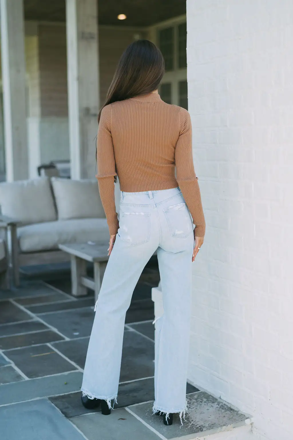 - Add a touch of sophistication to any look with the Marissa Mock Neck Top- Latte. With its ribbed knit material and cropped fit, this timeless piece offers a bustier effect that will give you an effortlessly stylish look. Its stunning latte color flatters all skin tones, making it the perfect go-to top for any occasion.