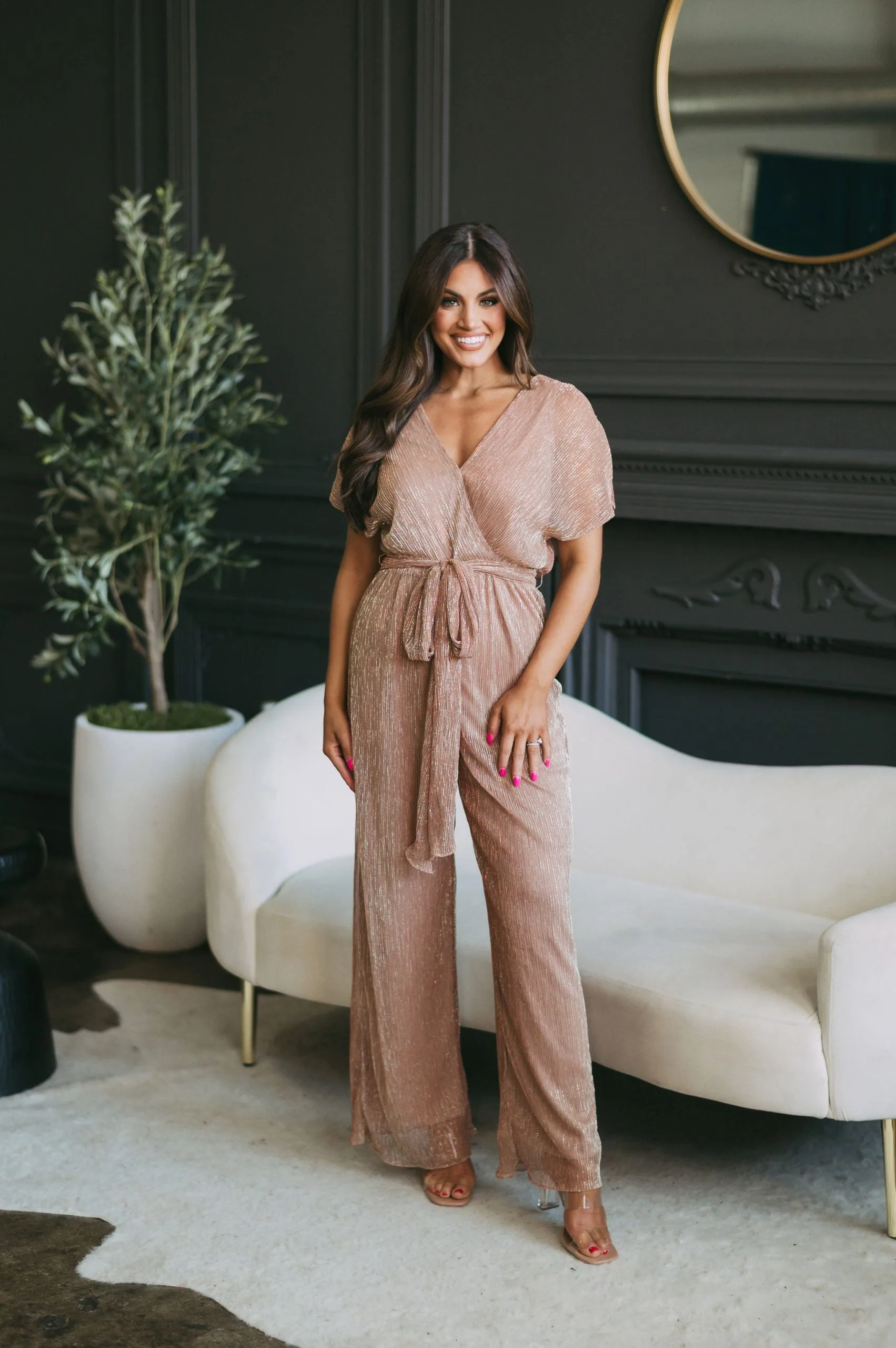 Make a sparkling statement in our Metallic Waist Tie Jumpsuit! This dazzling rose gold piece features a shimmery pleated fabric, a secure waist tie, a zipper closure back, and a button closure on the chest. Enjoy all-day comfort and luxury with this utterly glamorous and fully-lined jumpsuit!