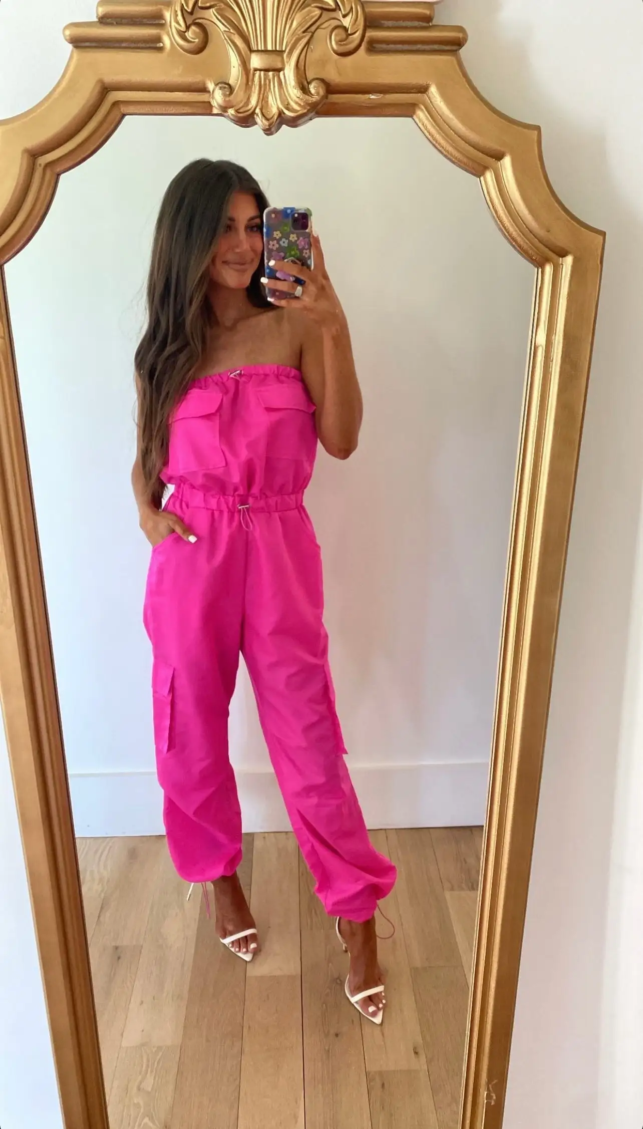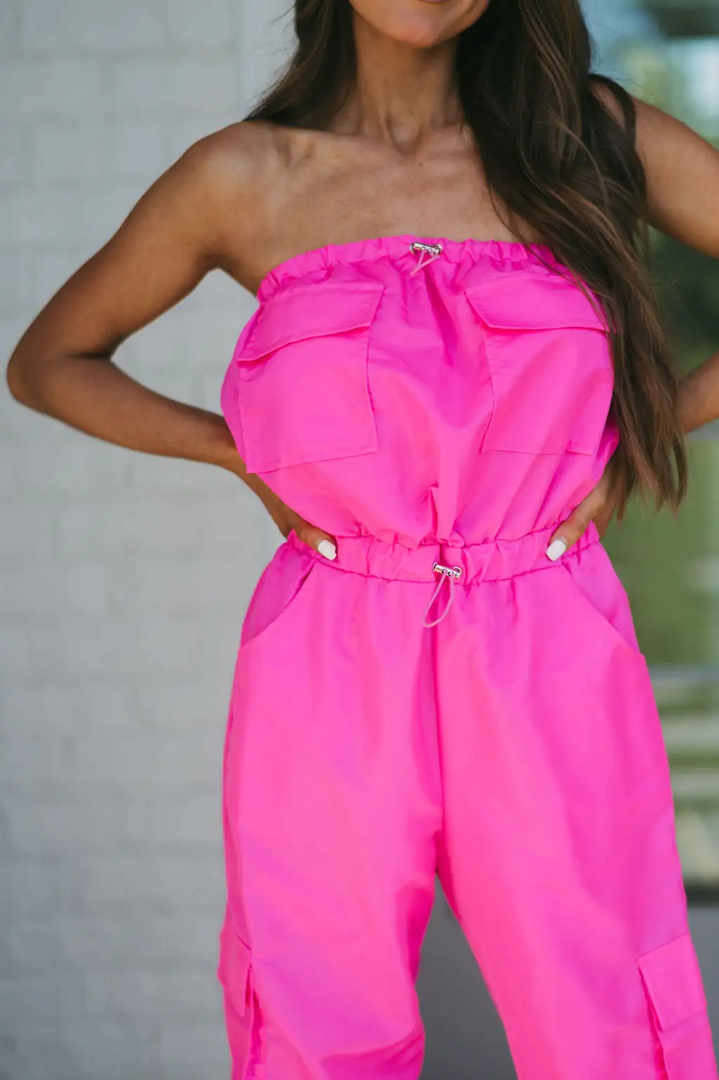 Look stylish and modern with this neon pink jumpsuit. Made of nylon, it features a strapless adjustable neckline and cargo style pockets for style and convenience. The elastic adjustable waistline and adjustable bottom hem ensure a comfortable fit. Be a trendsetter with this unique and eye-catching jumpsuit!