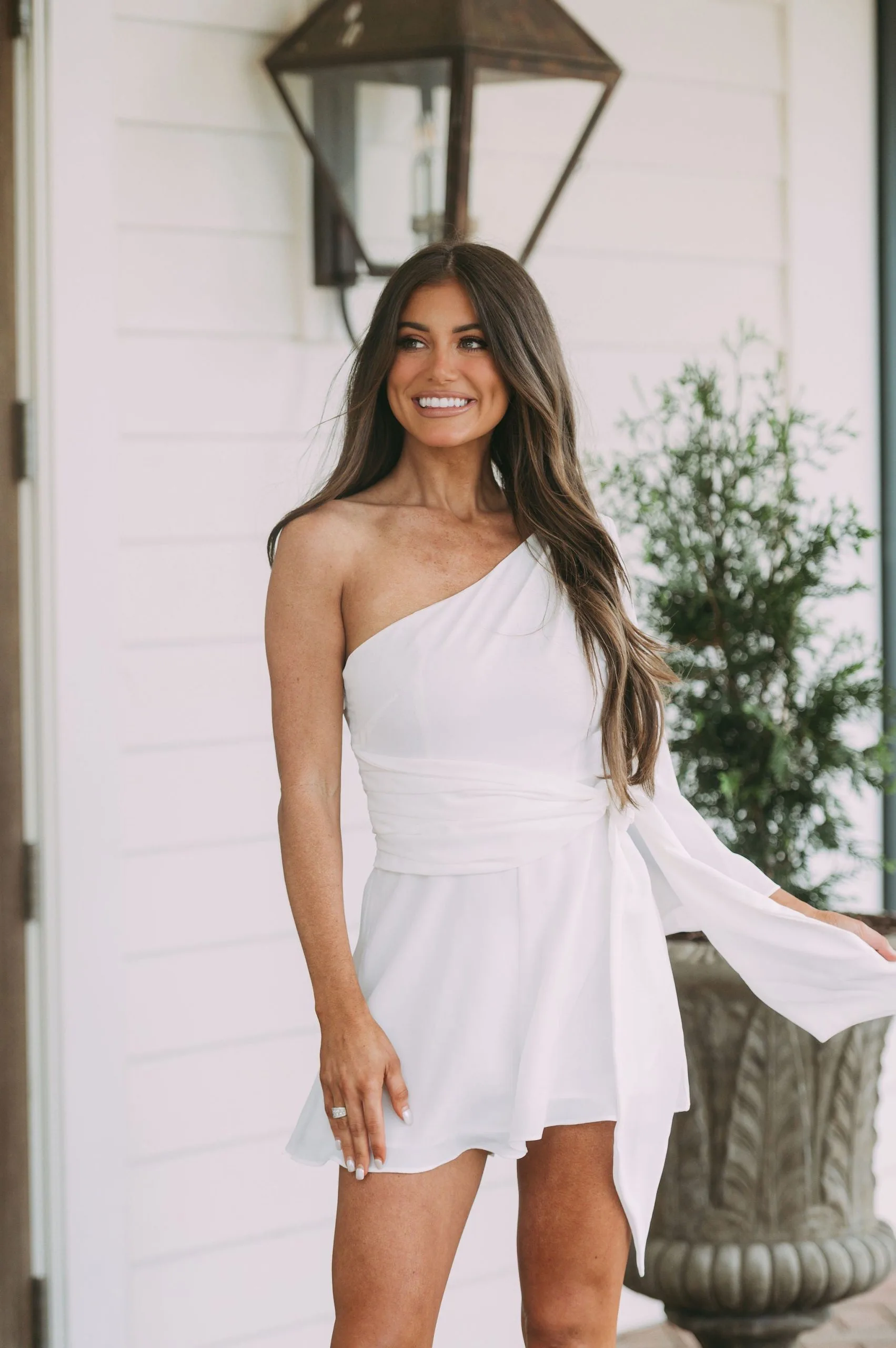 - This off white one-shoulder romper is designed with subtle sophistication. Its side-tie closure provides a tailored fit while the side zipper offers easy on/off. Fully lined for extra comfort. Perfect for any occasion.
