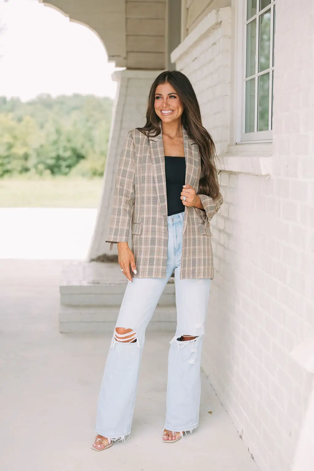 - Update your wardrobe with this timeless plaid oversized blazer – the perfect way to add the preppy-luxe look to your outfits. Featuring a taupe and black plaid pattern, a collared neckline with a classic cut, side pockets, and an interior satin lining, you’ll be looking chic and stylish in no time. What are you waiting for?