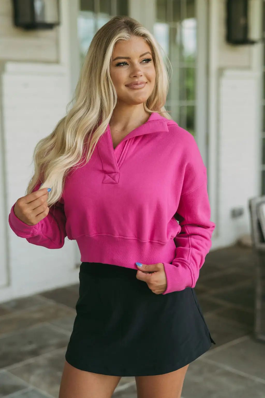The Quarter Zip Hooded Pullover in berry is a timeless piece of outerwear. It features a cropped fit with a quarter zip closure and a hood for added coverage. This piece of apparel is perfect for staying warm and stylish in any season!