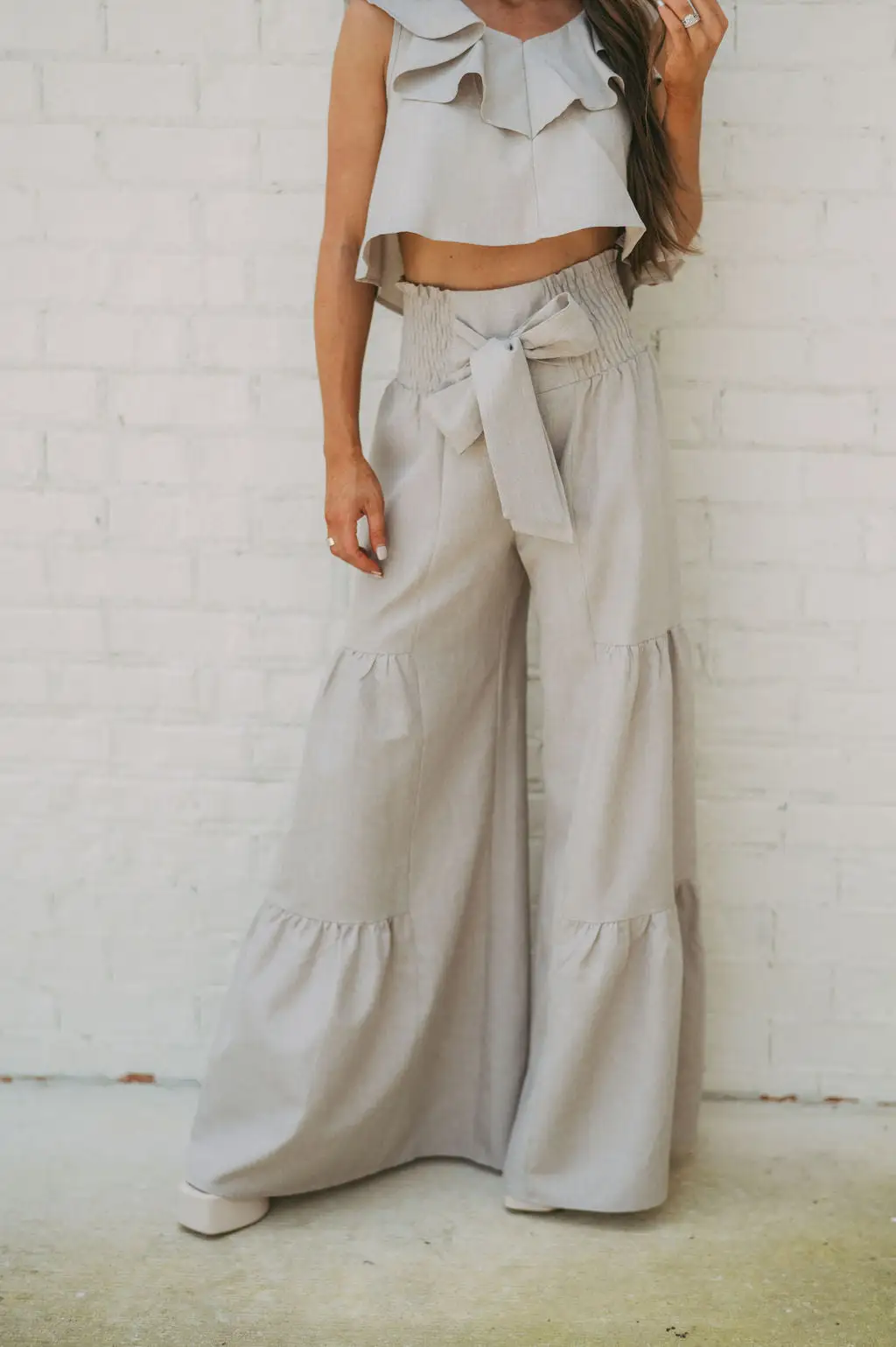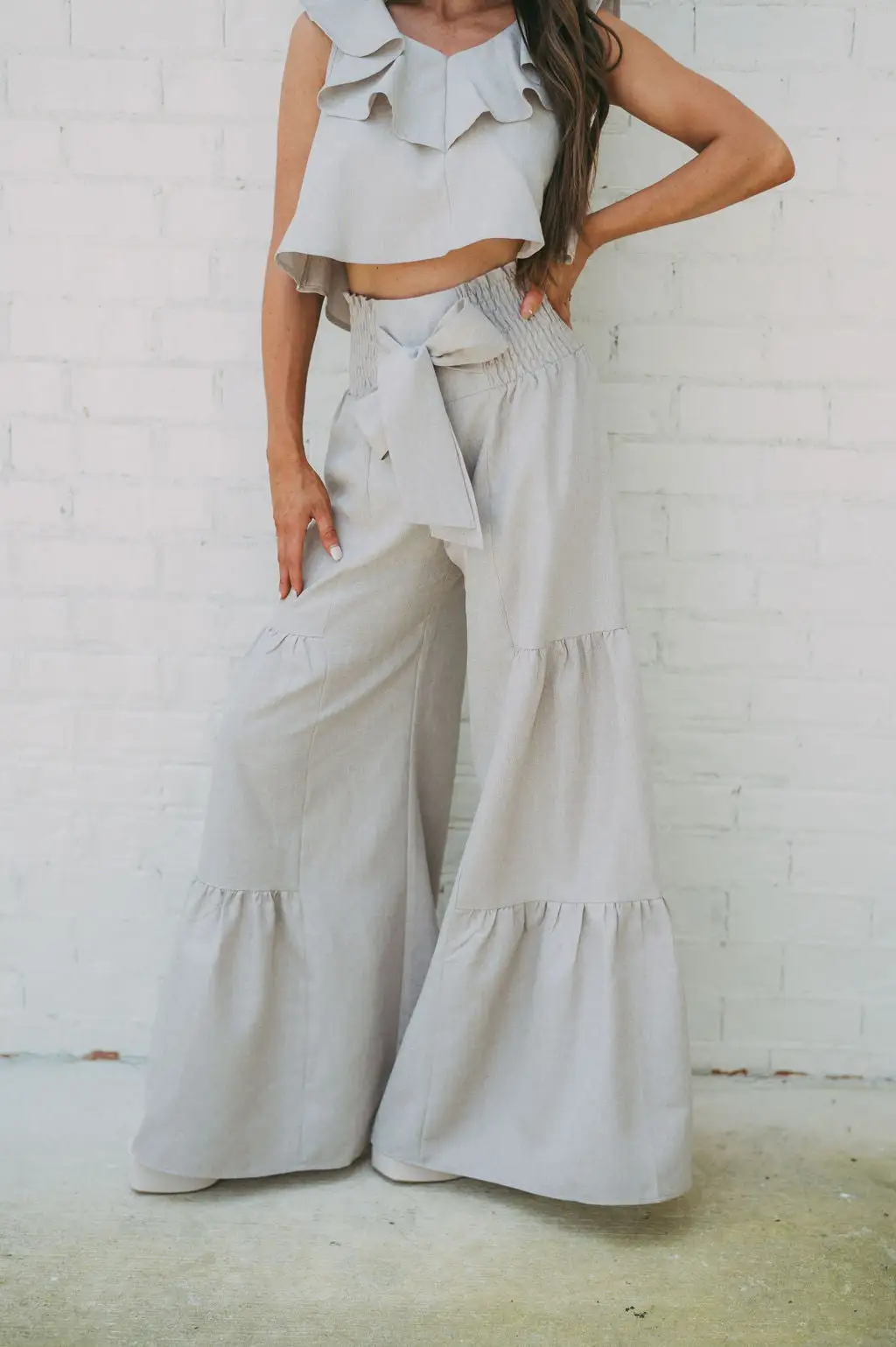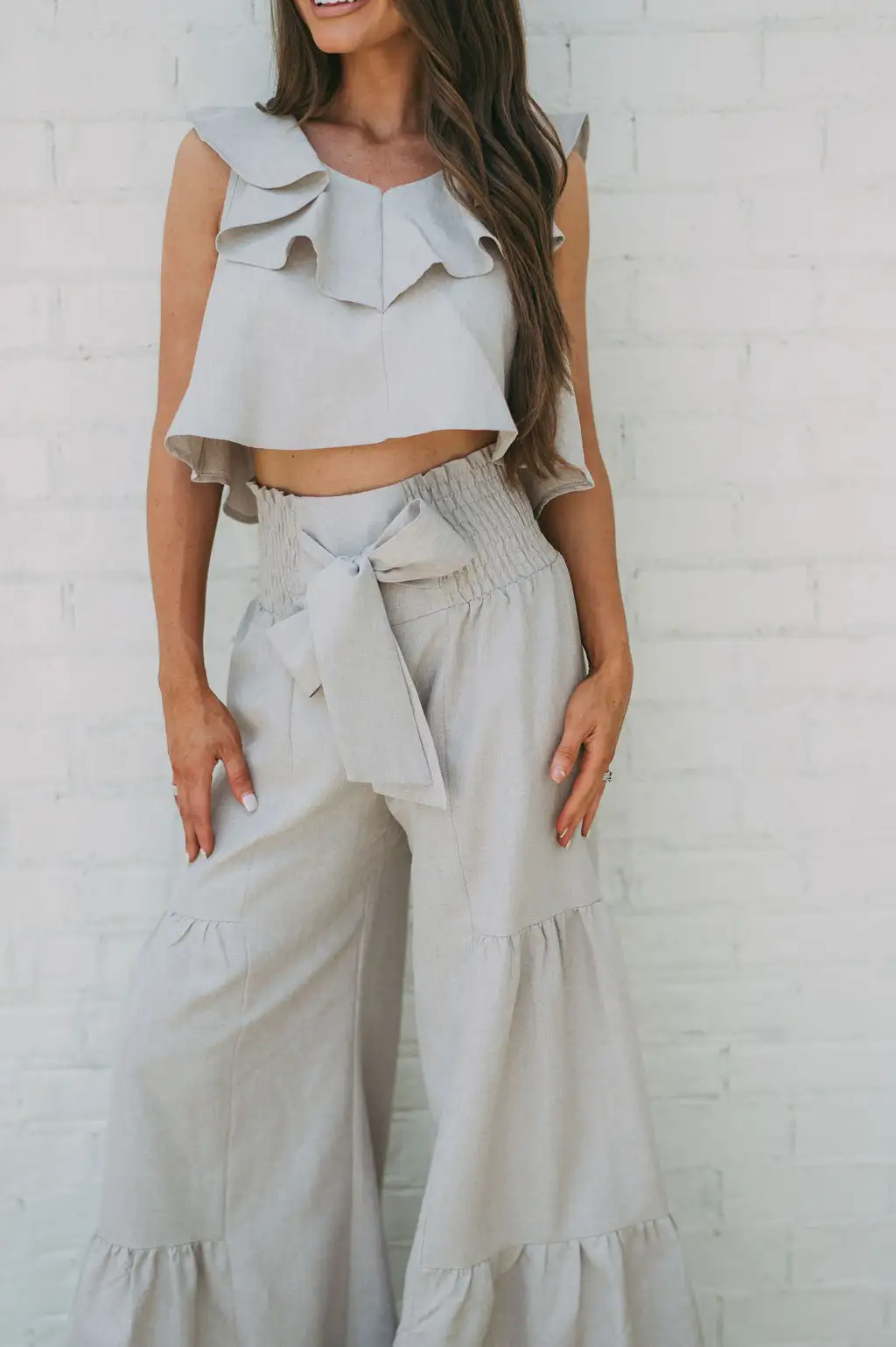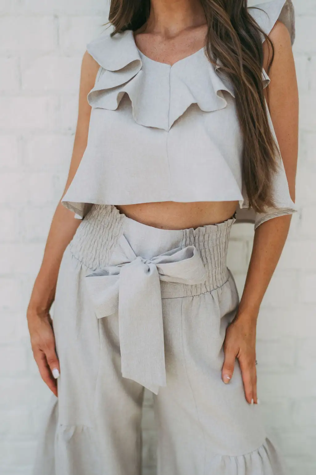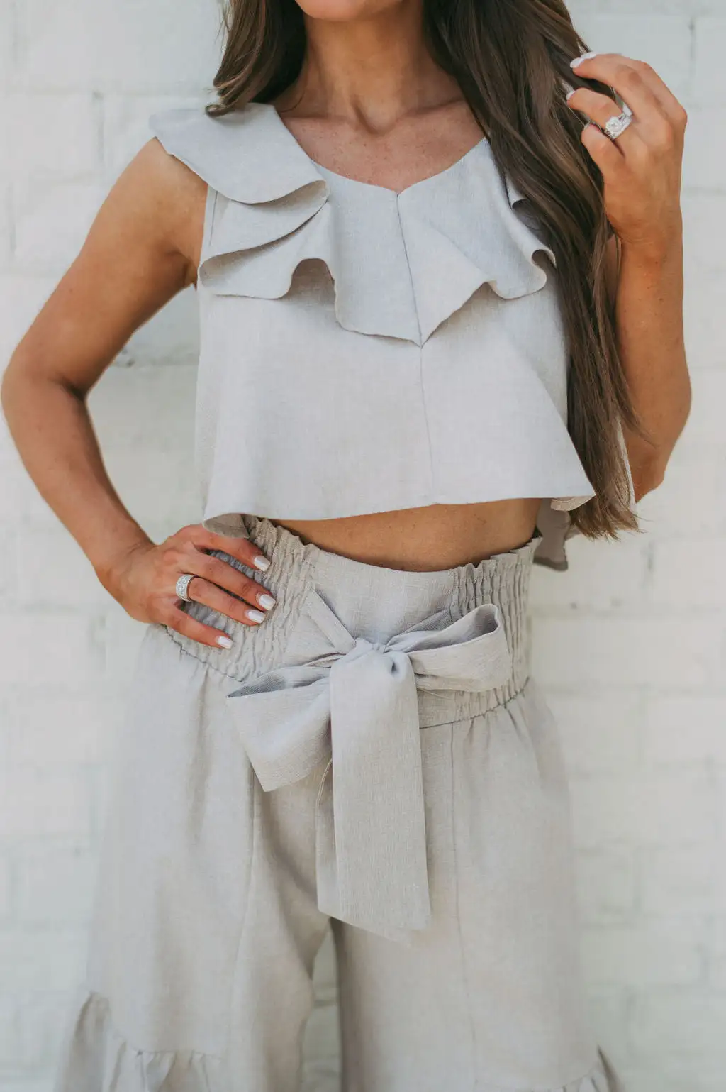 Our Ramie Ruffled Top is a timeless wardrobe staple. It comes in a dark oatmeal hue and features a ruffled neckline and cropped bottom hem. This sleeveless top is a perfect choice for any occasion!