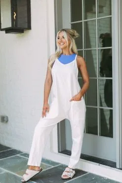 - Discover effortless style with the Relaxed Jersey Jumpsuit. Crafted from an off white fabric, this oversized one-piece includes a comfortable fit, front pocket accents and jogger-style bottoms for a modern aesthetic. Look and feel amazing any day, any time!