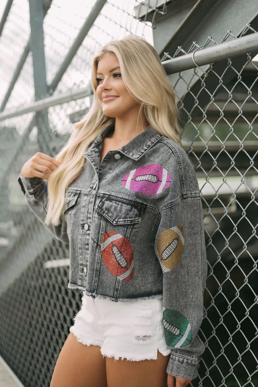 This Rhinestone Football Denim Jacket is a perfect way to express your love for the game! It features a washed black denim jacket with colorful rhinestone footballs, and a raw edge bottom hem. Plus, it buttons up the front for easy on and off. Show off your spirit in style!