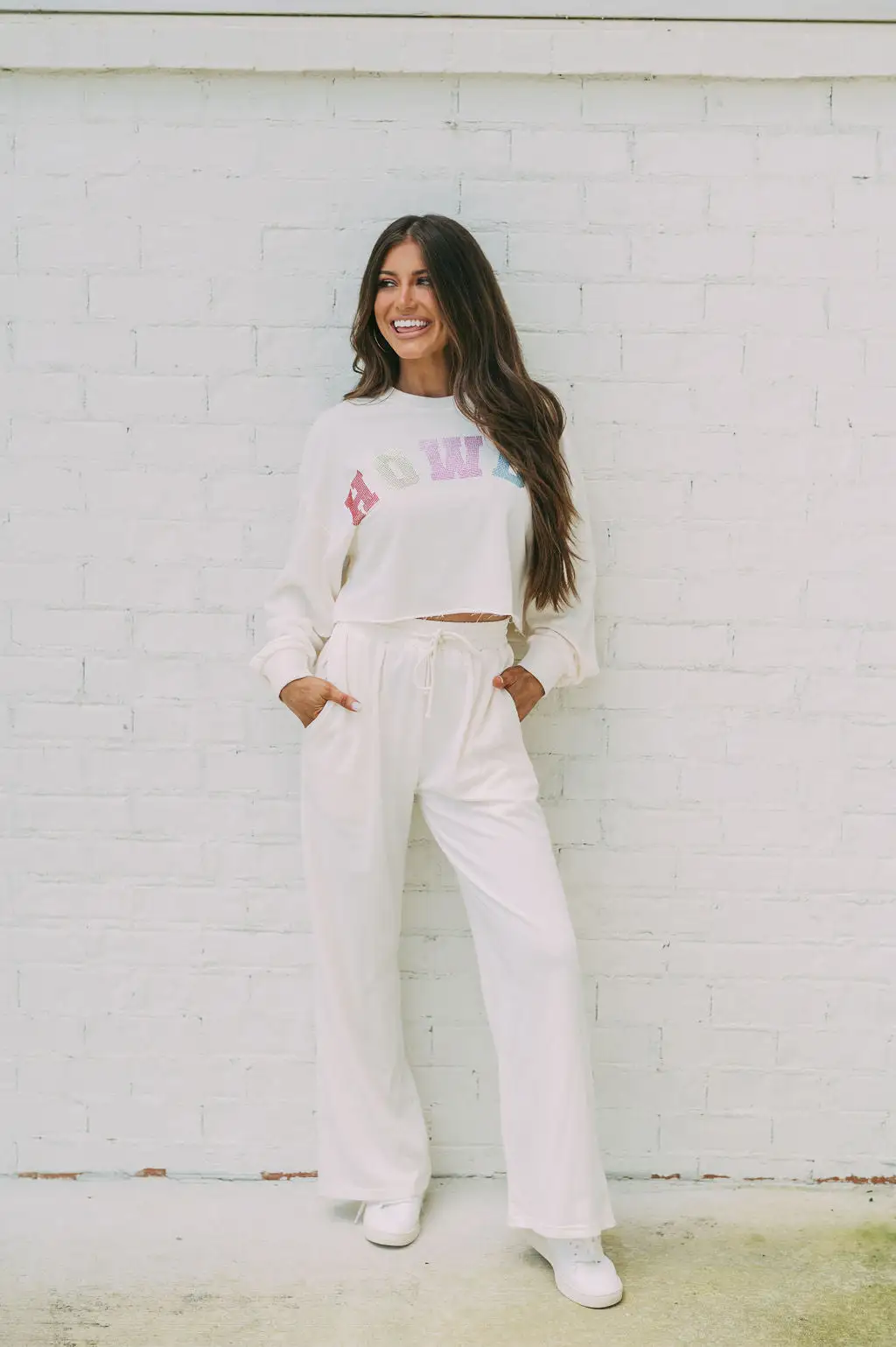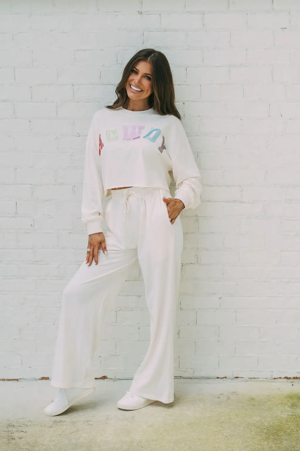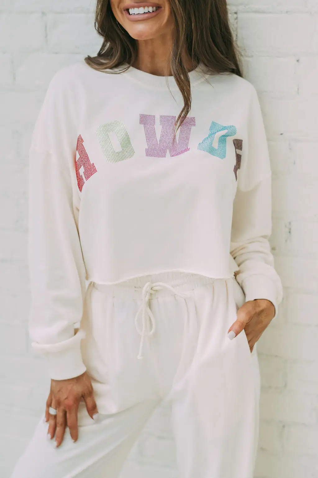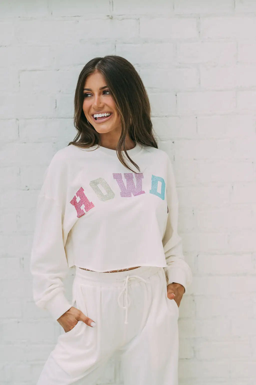 Be fashionable and trendy with this Ivory French terry top featuring “Howdy” spangled in multi-colored rhinestones. Its unfinished cropped bottom hem makes it a perfect, yet unique, laid-back outfit!