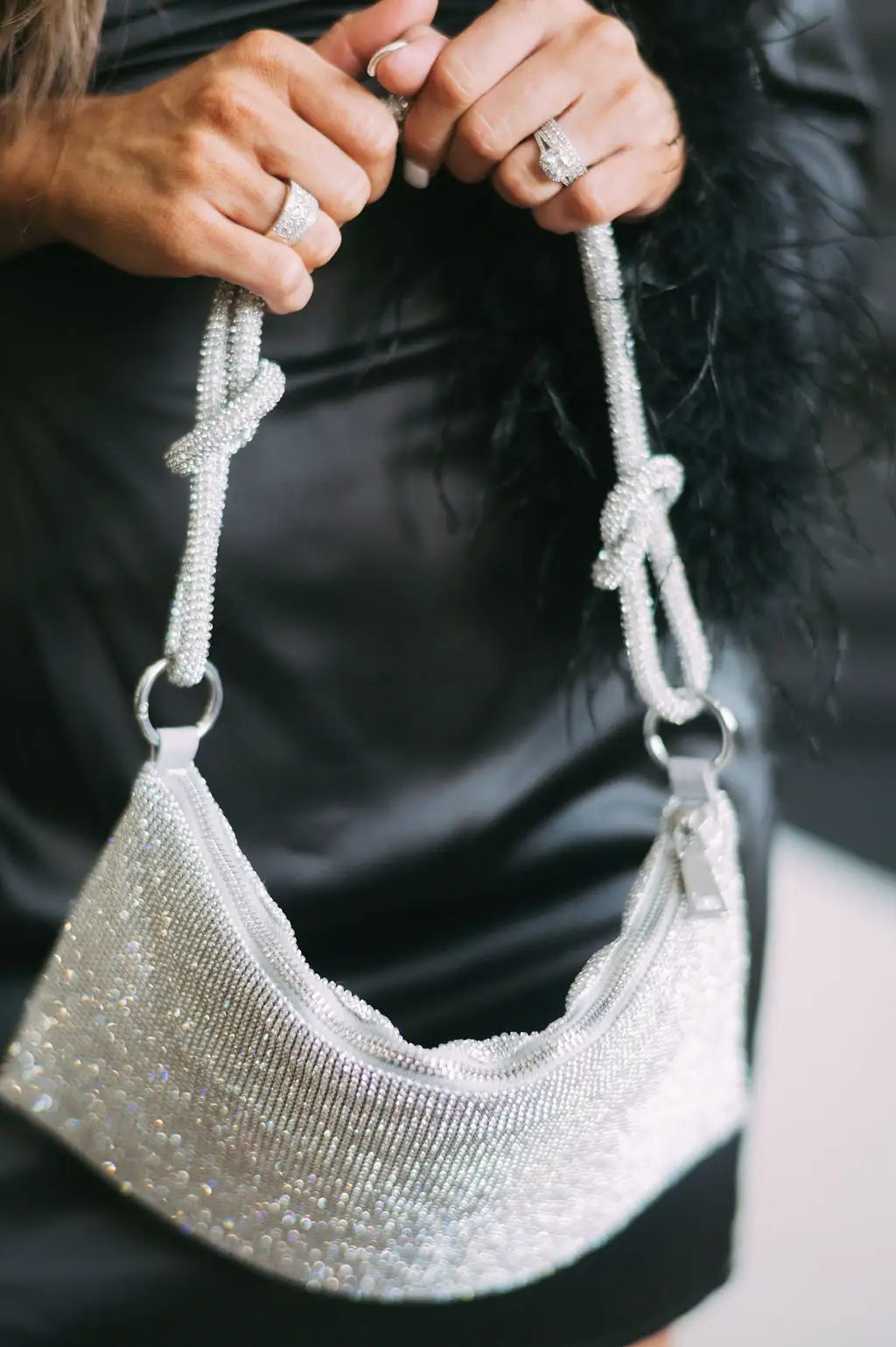 This chic Rhinestone Shoulder Bag is the perfect addition to your special event outfit. It features dazzling rhinestones and silver accents, along with a zipper closure for added security. Make a statement and complete your look with this glamorous accessory.