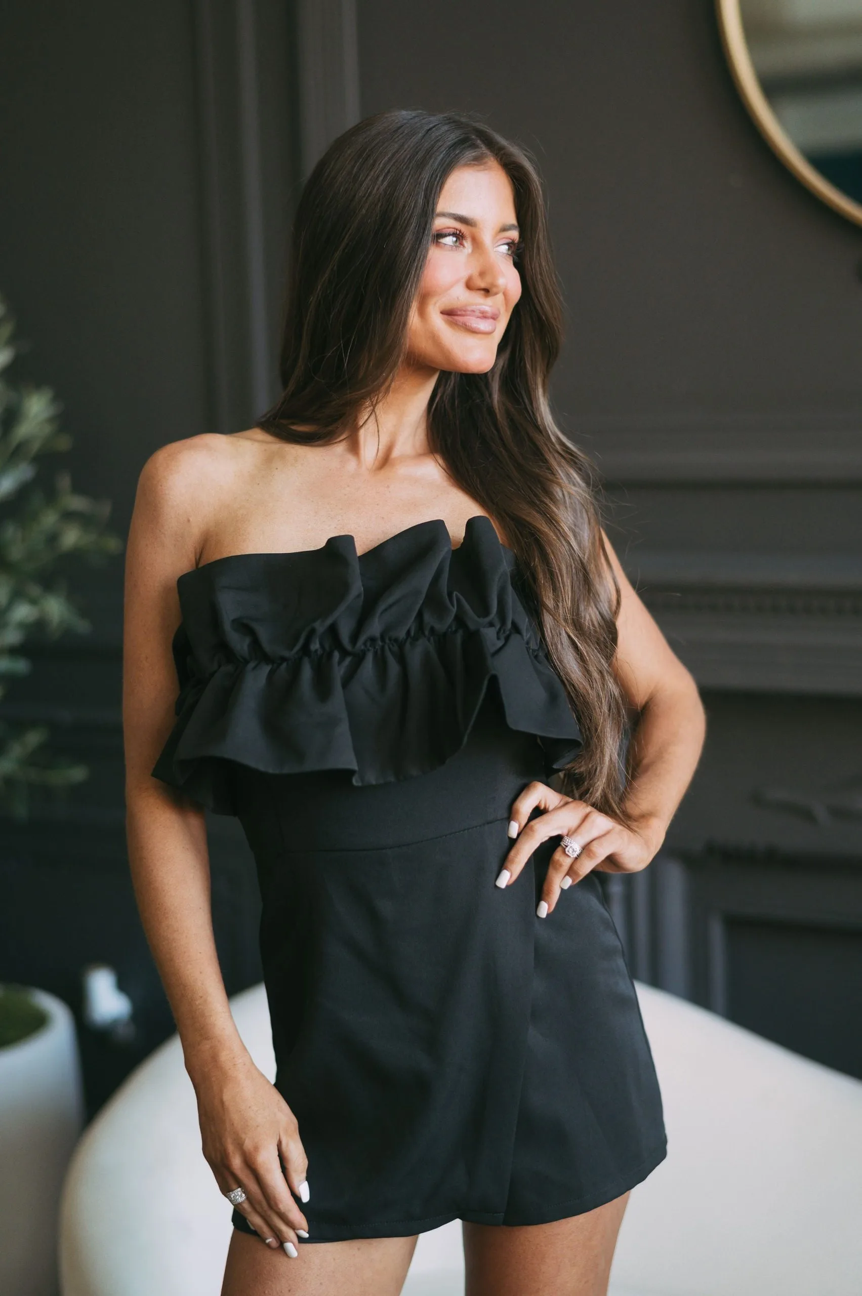 - Feel effortlessly chic in this stunning ruffled overlay romper. Made with a black strapless design and ruffled detailing, this gorgeous romper comes with a front overlay and a back zipper closure to keep you comfortable and stylish all day long.