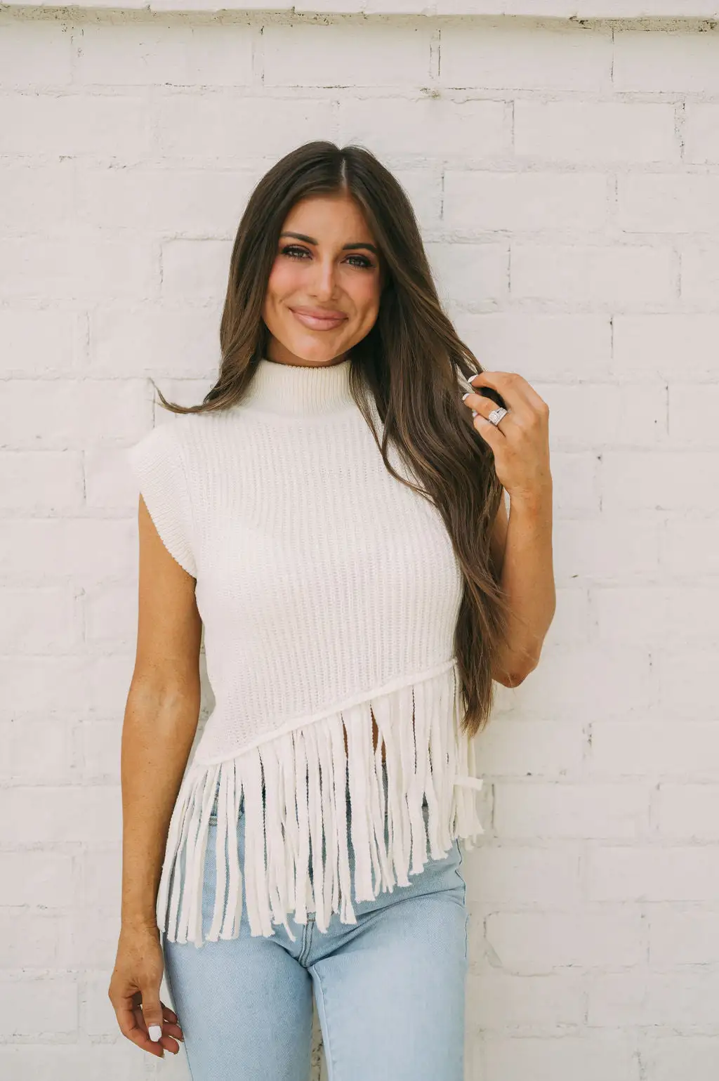 This sleeveless cream sweater is crafted from soft fabric and features a fringe accent at the bottom. With its stylish turtleneck, it’s a timeless way to stay warm this season.