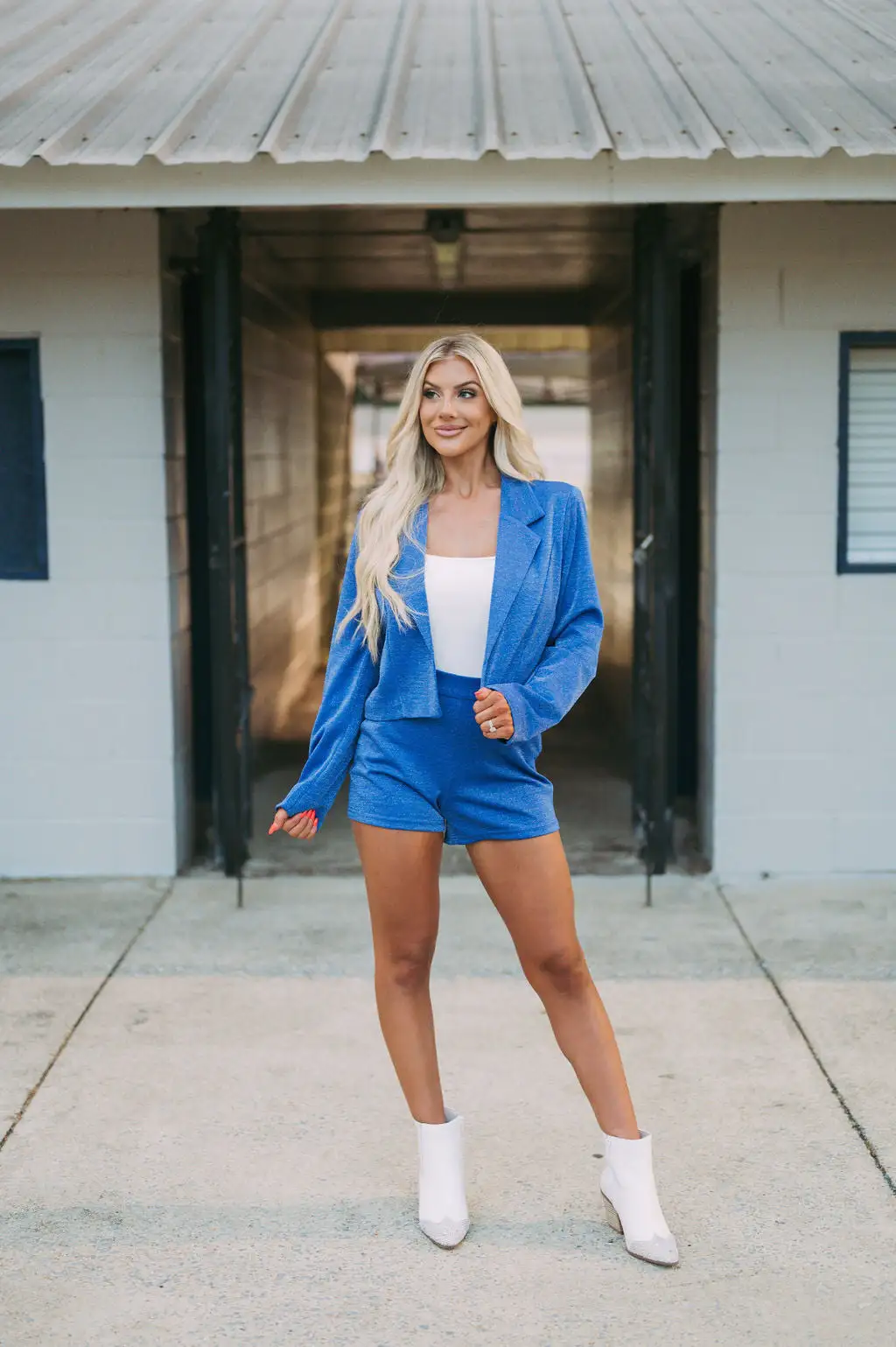 Enchant the crowd with this magnificent blue sparkle set! Crafted with a blazer style collared top and shoulder padded sleeves, this look is classically stylish with a touch of glamour. The mid-rise shorts, complete with a zipper closure, draw the eye for an unforgettable outfit. Shine your brightest and take your look to the next level!