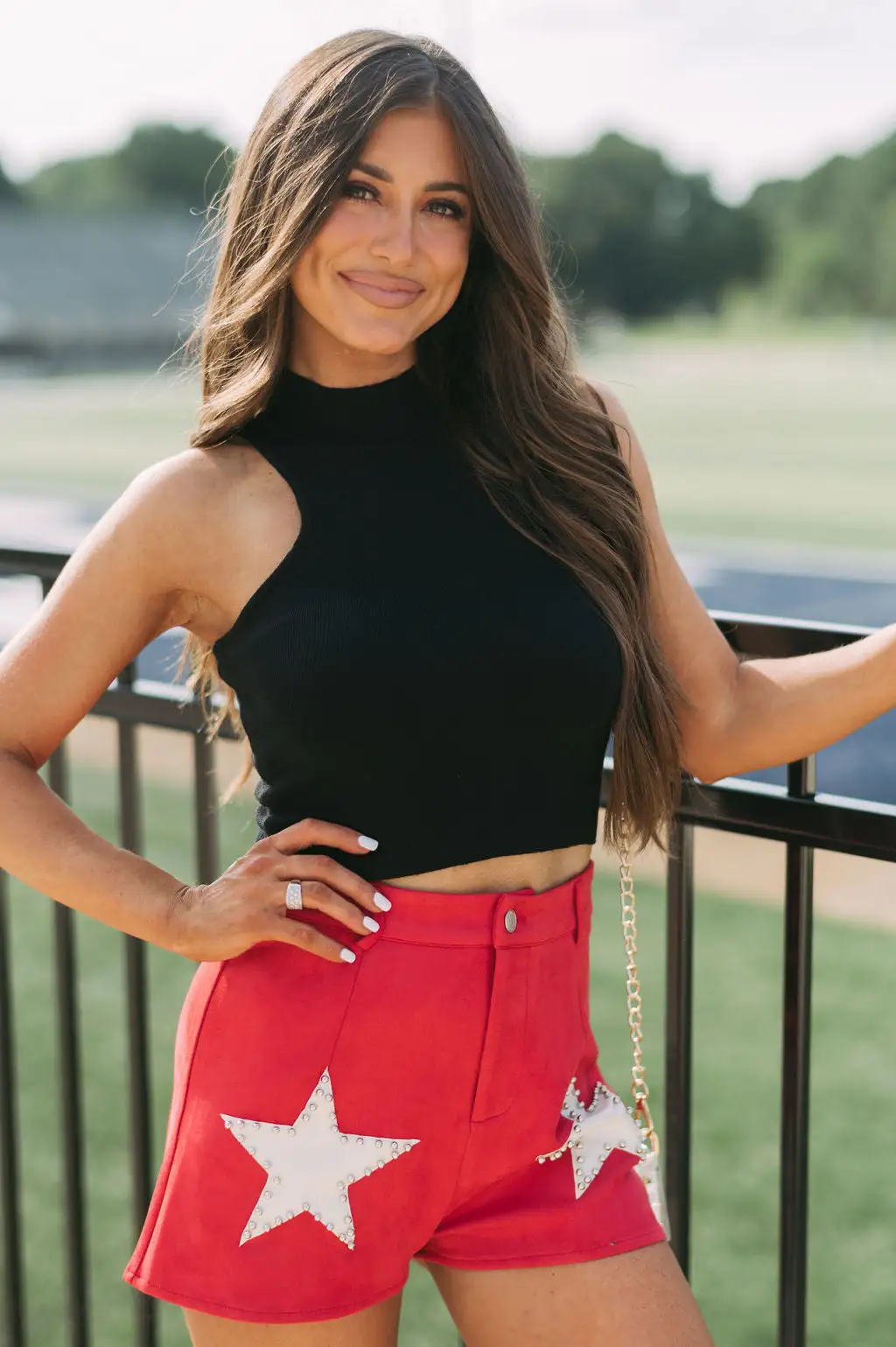 - Make a bold statement in these sleek, red and cream star accented shorts. Crafted with premium suede fabric with a high-waisted fit and button fly closure, these shorts are sure to make an impression. Why not make a star of your wardrobe?