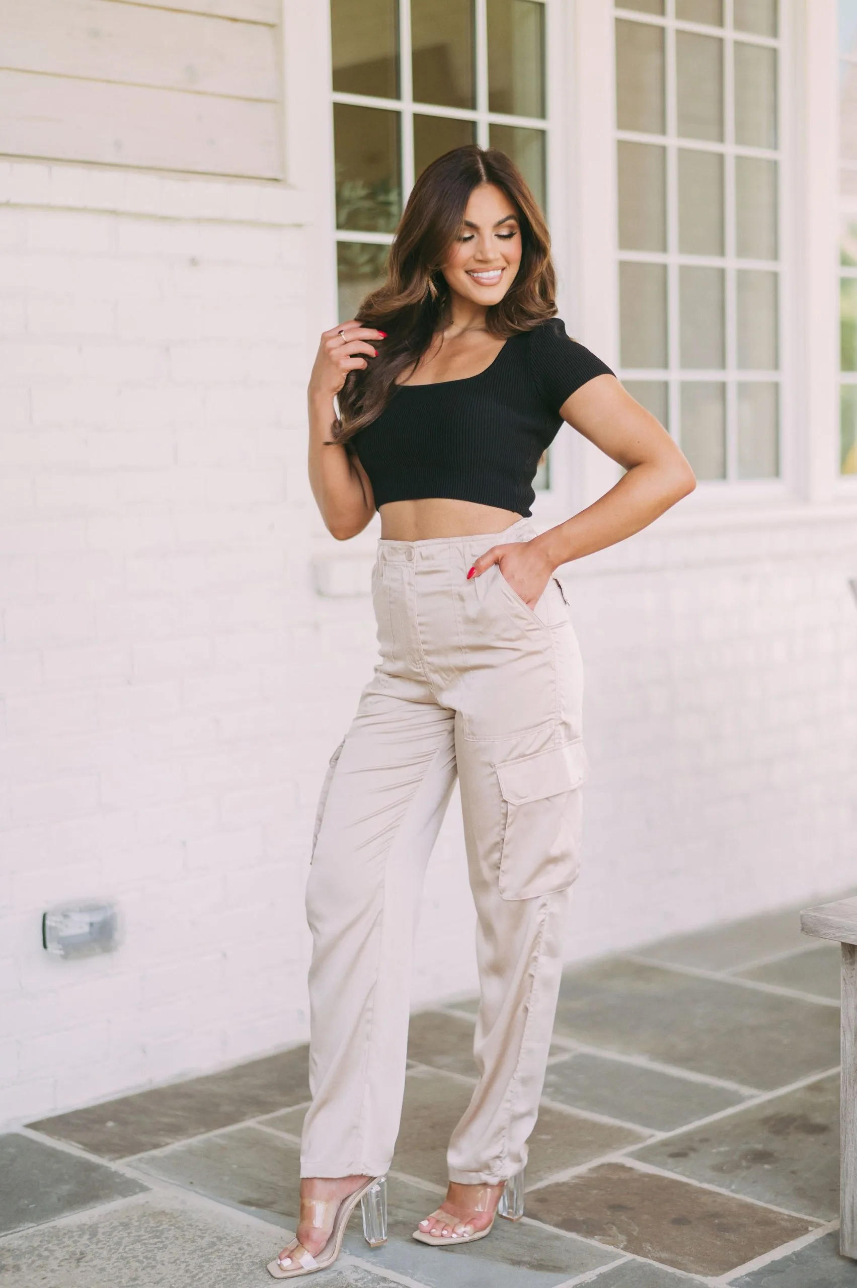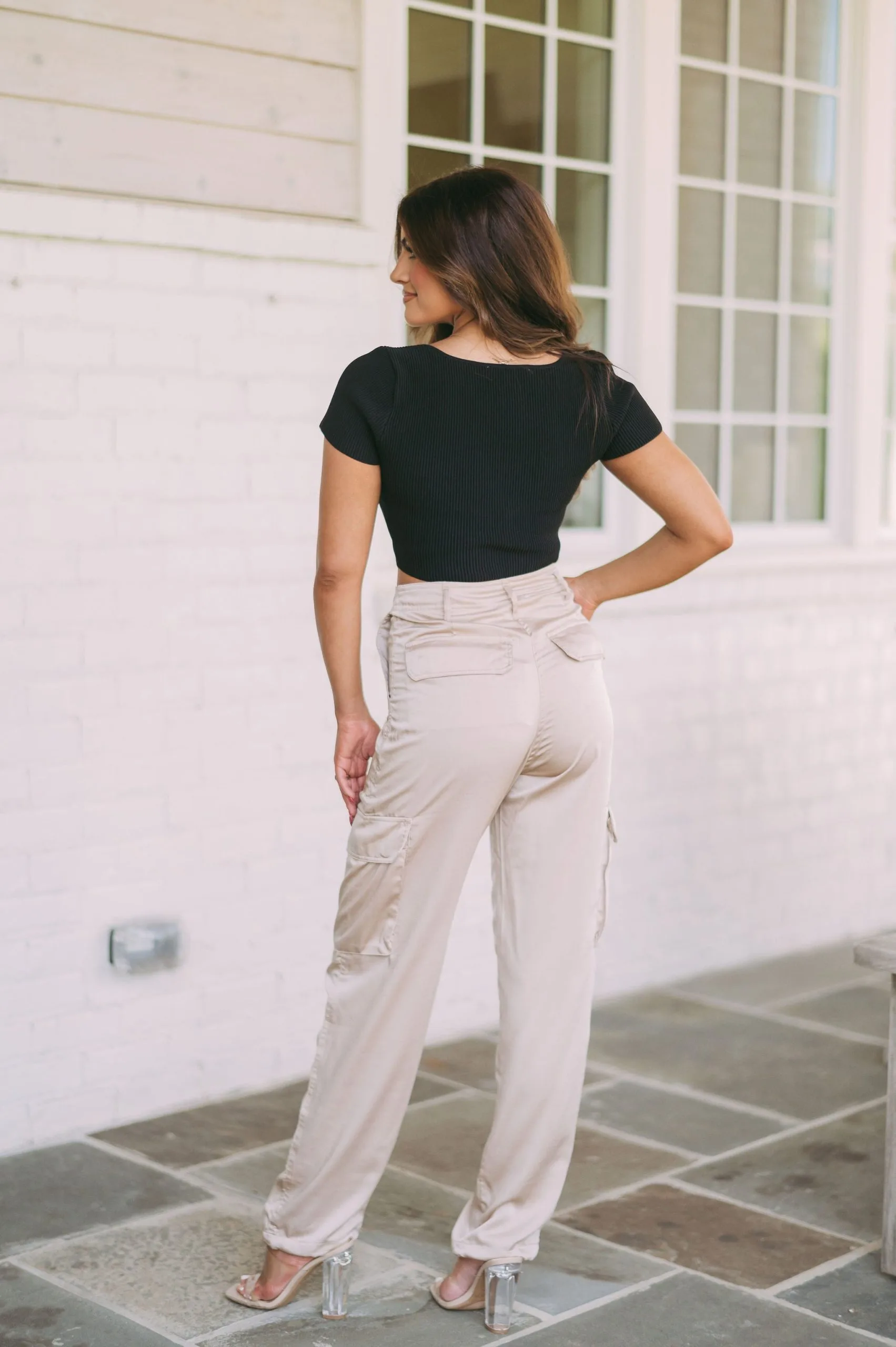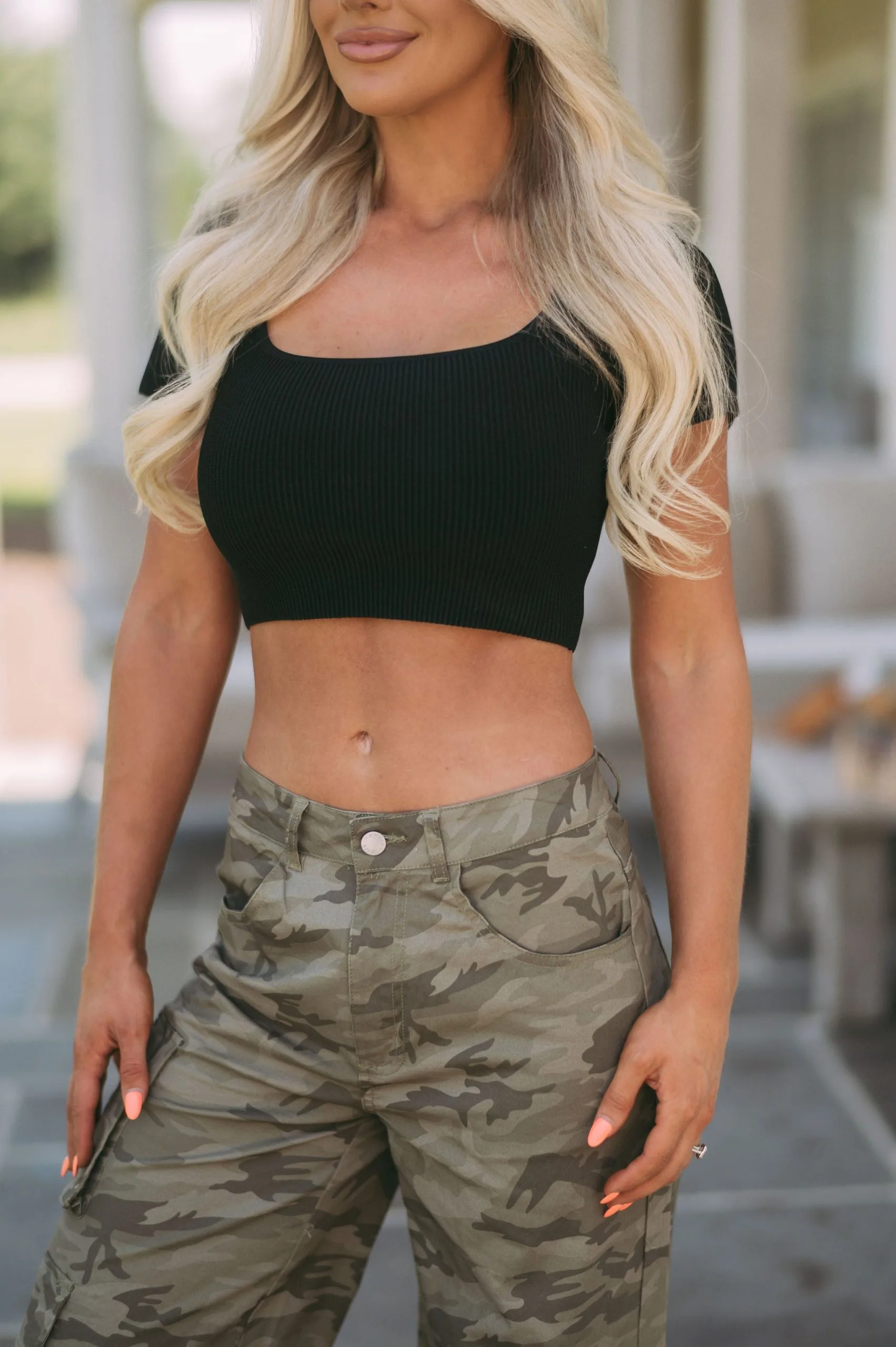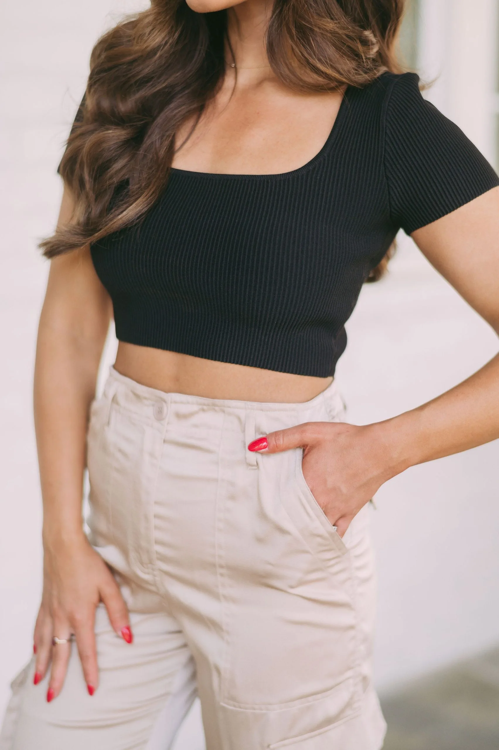 - Look stylish while staying comfortable in this Taite crop top. Crafted from a ribbed material, this top features a squared neckline and a classic black color. Its lightweight design is great for everyday wear and perfect for layering. Enjoy form and ease with this must-have piece.