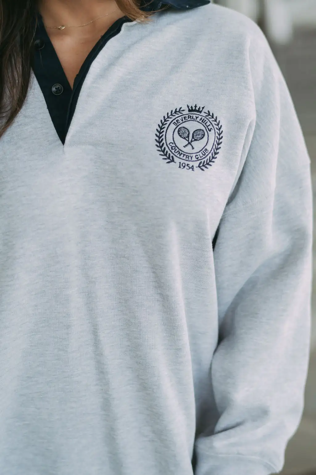 This heather grey tennis polo pullover features a navy collared neckline and quarter button up front. It’s finished with detailed graphic patches for a classic, sporty look. With the combination of style and quality, you’ll be ready to take on the court with confident comfort!