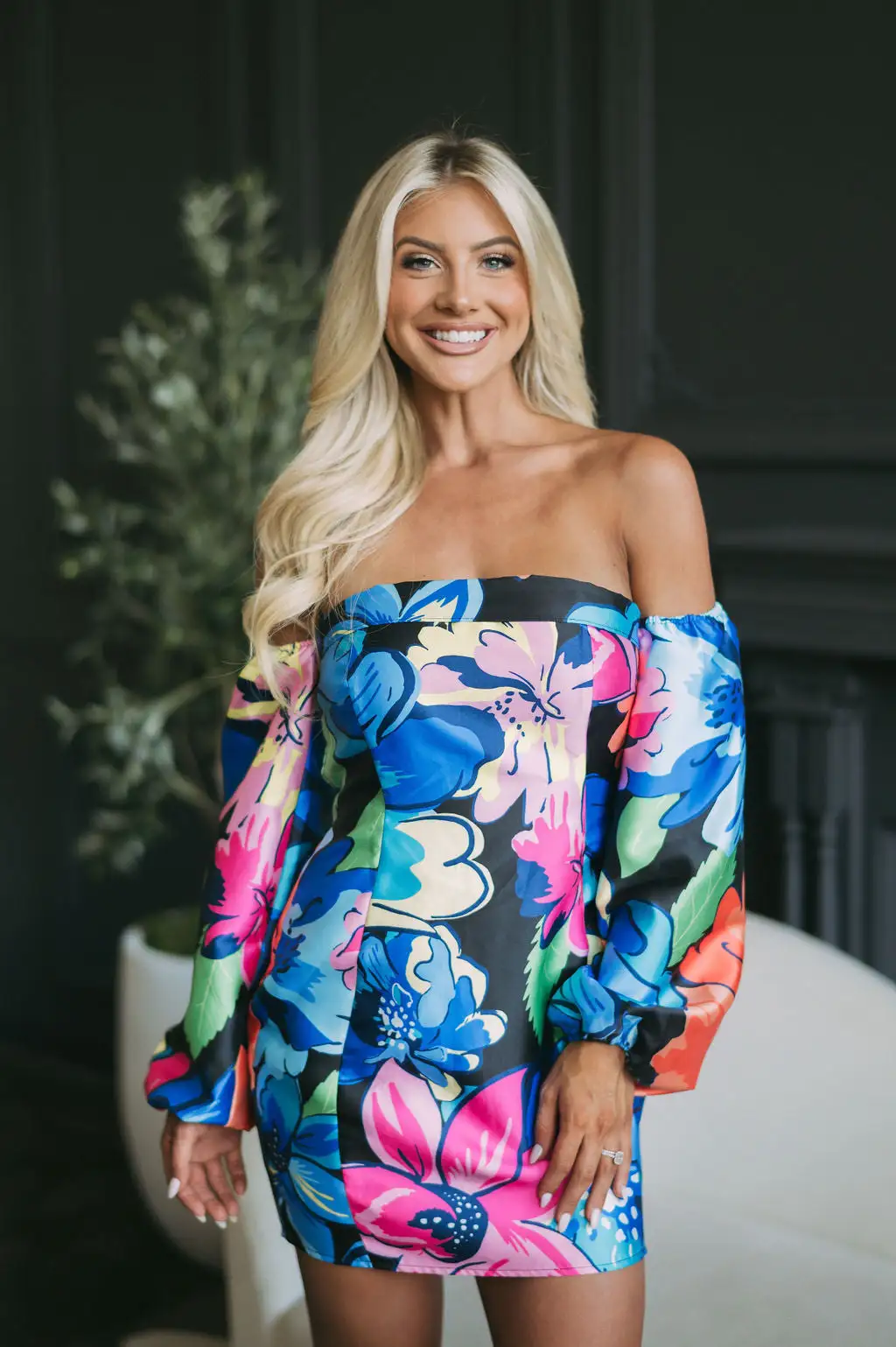 This Vibrant OTS Floral Dress is the perfect addition to your wardrobe! Brighten up any day with the multi-colored vibrant floral print. Featuring off the shoulder long sleeves and a zipper closure back, you can look gorgeous and feel comfortable at any occasion! Let your style bloom!