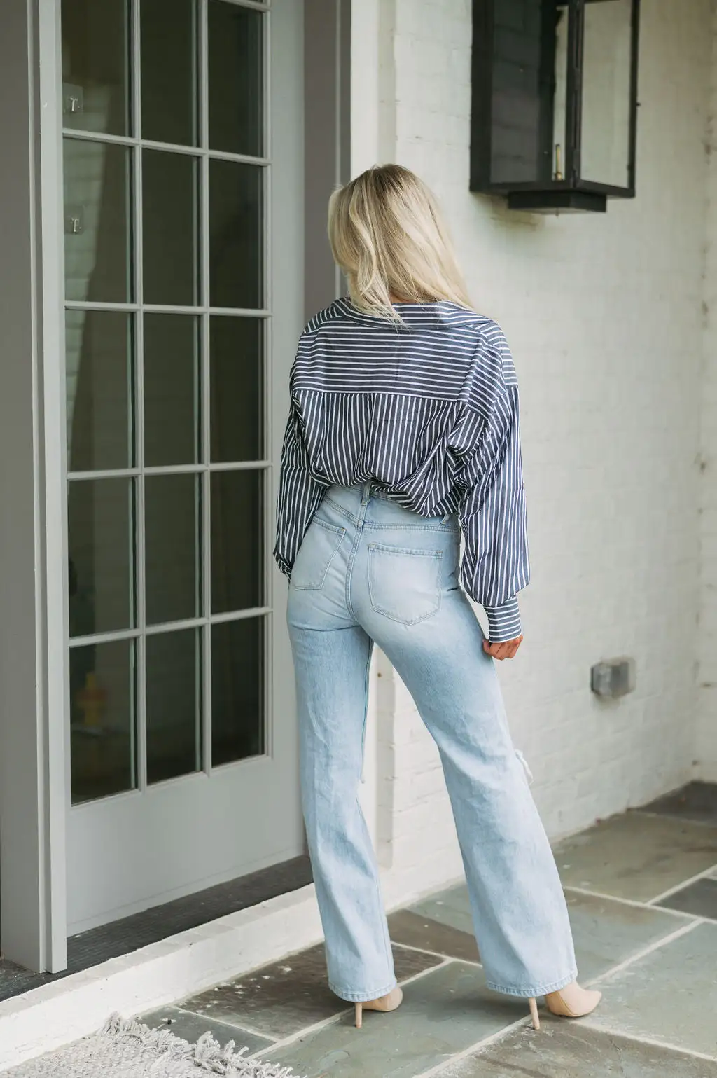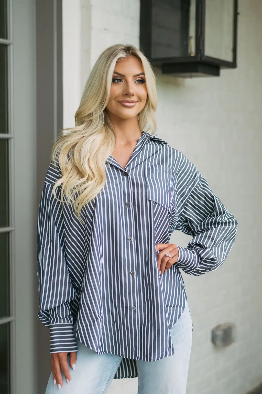 Be inspired by the Whitt Striped Top, featuring stylish grey and white stripes, a collared neckline, a button down closure, and a front pocket. Its slightly oversized fit offers a casually chic look that’s comfortable and on-trend. Transform your wardrobe with effortless sophistication!